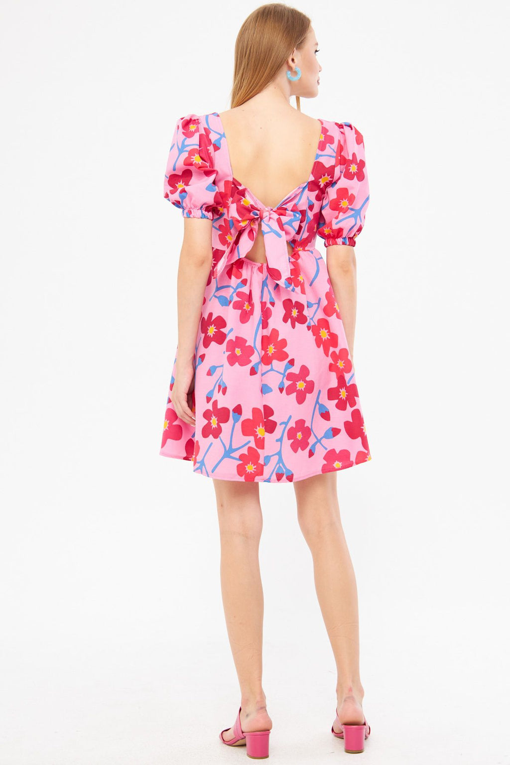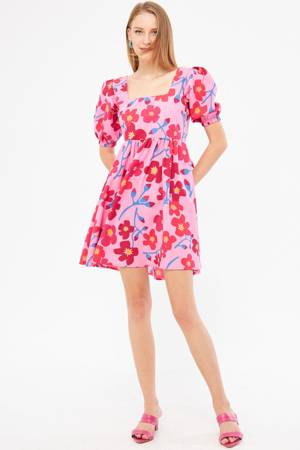 Female Pink Square Yaka Sıme Bağlama Detailed Waist Waist Waisnous Princess Arm Mini Dress ARM-24Y001078