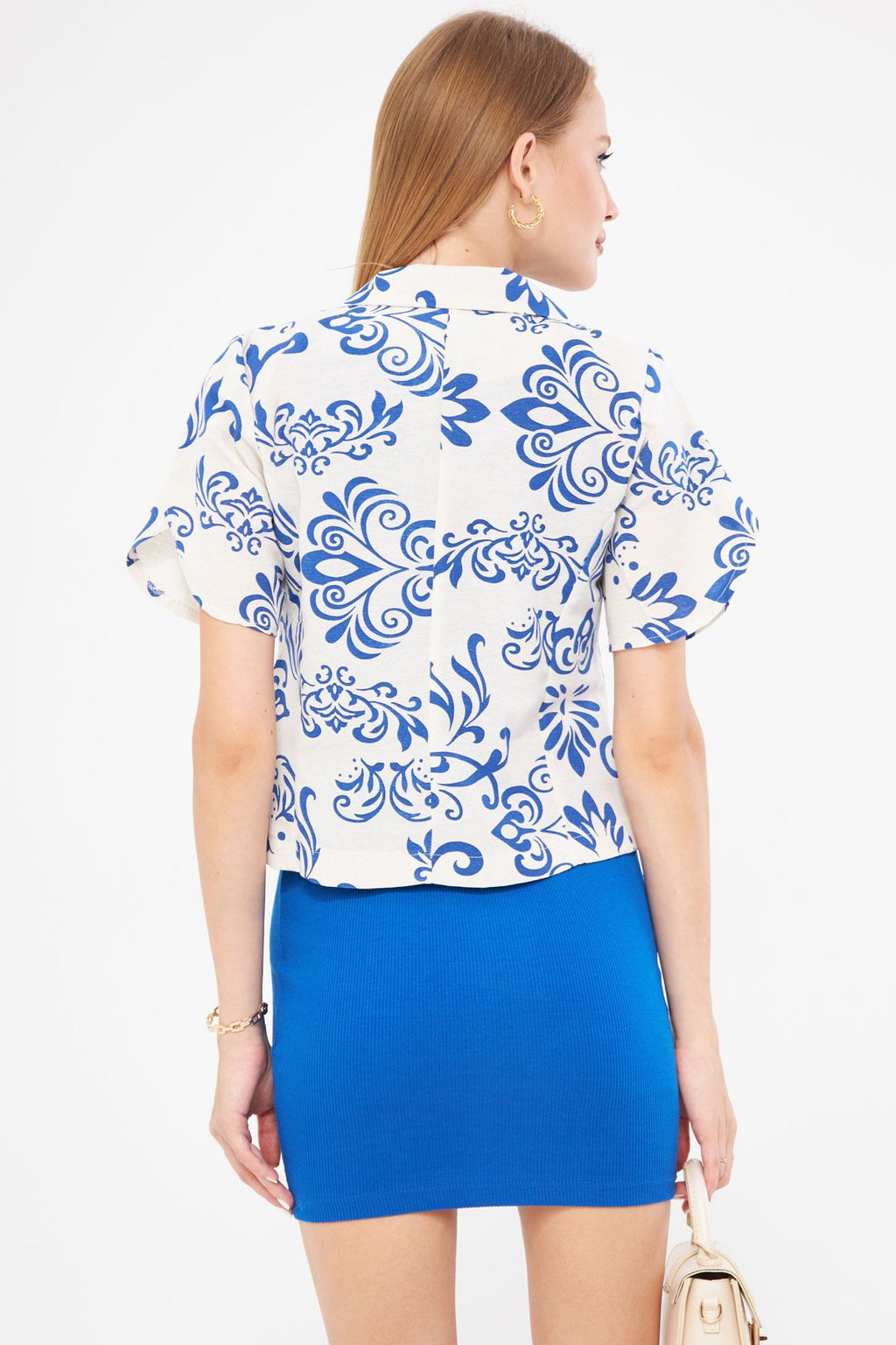Female Saks Linen-Looking Patterned Left Slit Crop Short Sleeve Jacket ARM-24Y001095