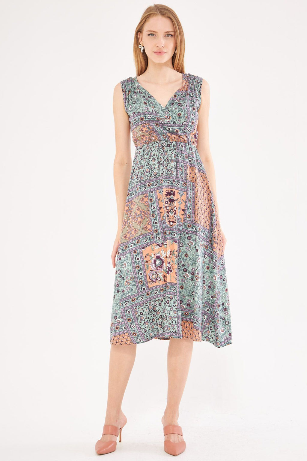Female Salmon Patterned Waist and Shoulder Cruve Cruve Midi Boy Dress ARM-24Y001052