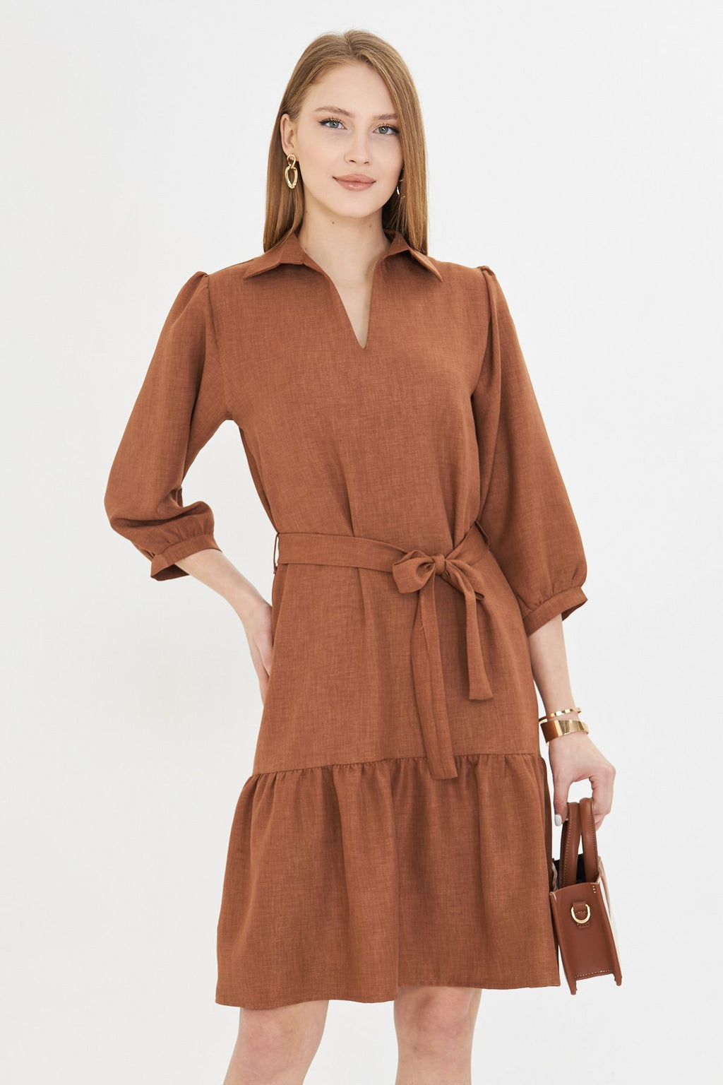 Female Taba Shirt Neck Quarter Arm Waist Belled Skirt Shirred Dress ARM-25Y001010