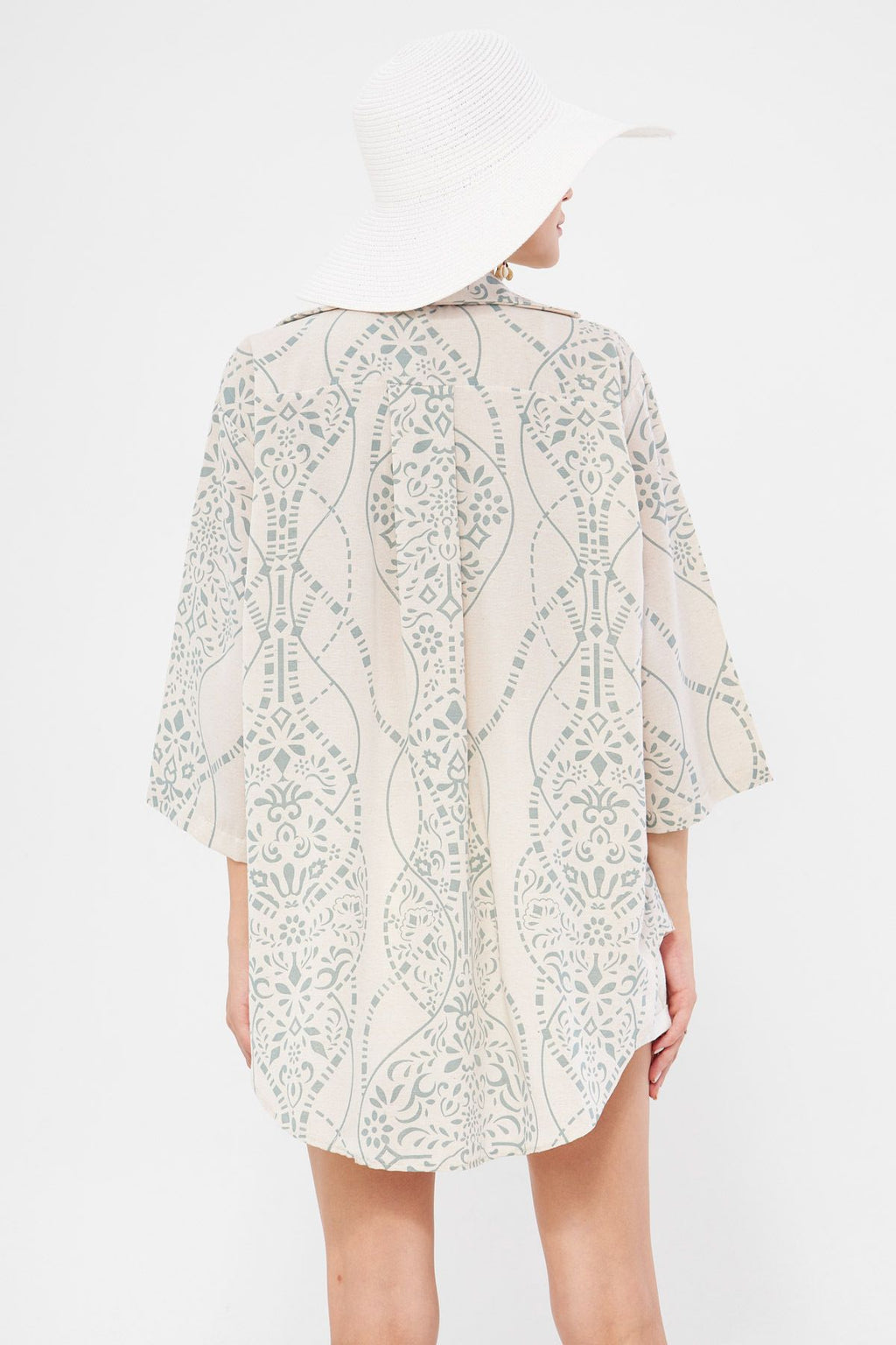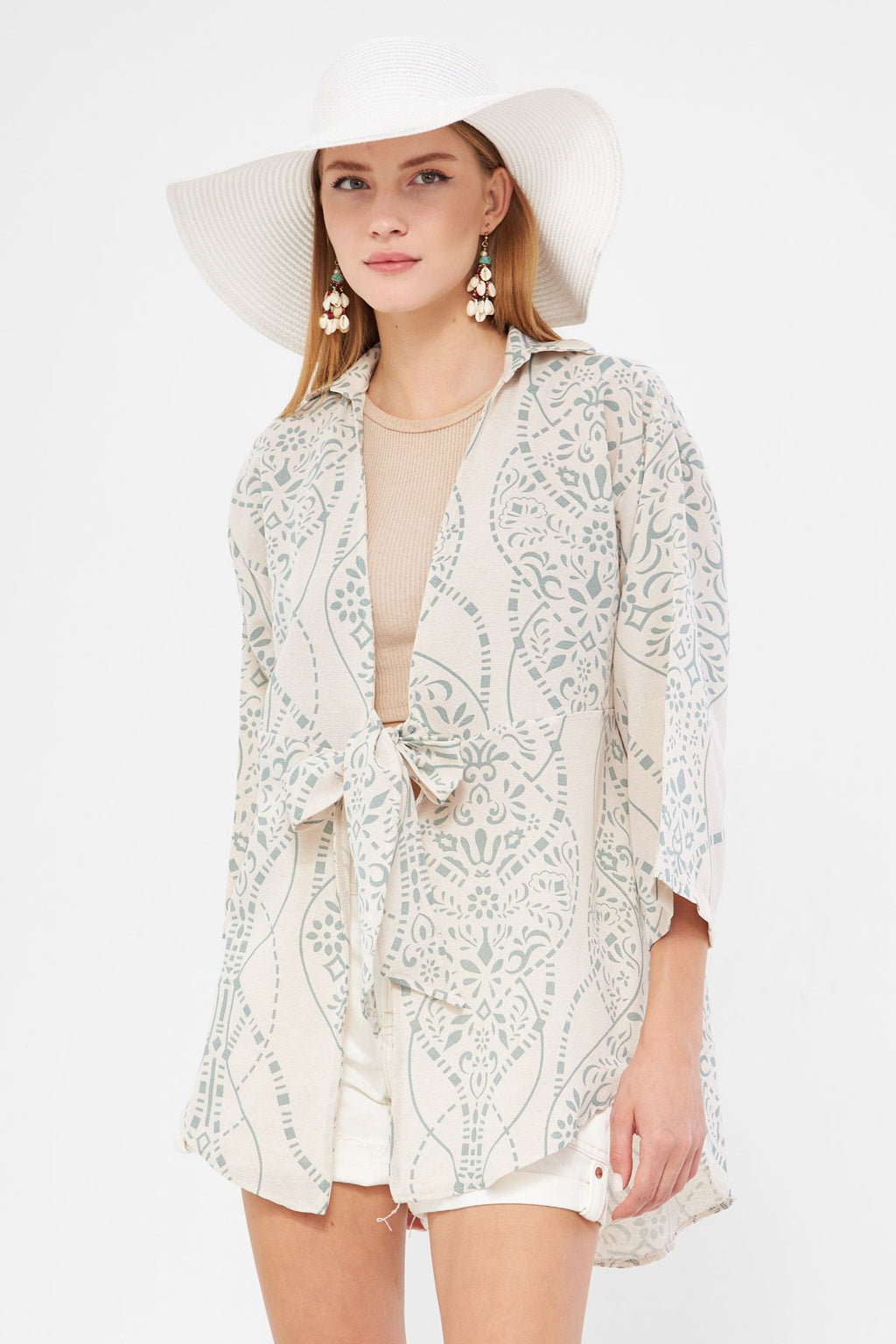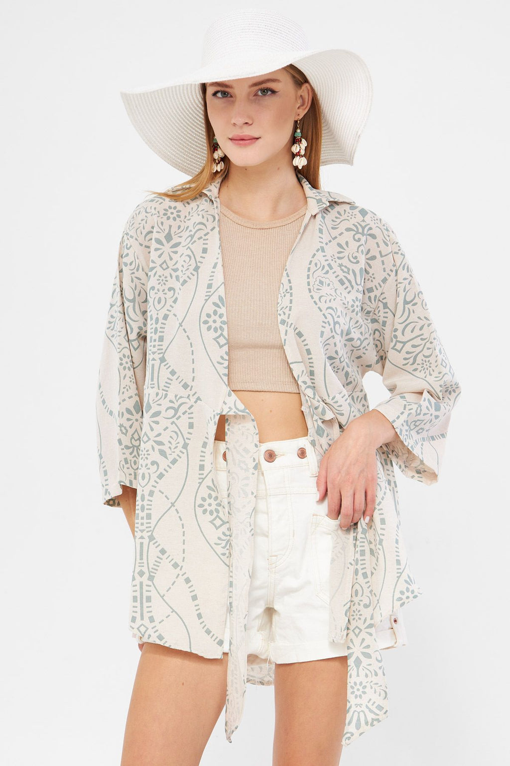 Female turquoise patterned linen-looking front-binding kimono shirt ARM-24Y001079