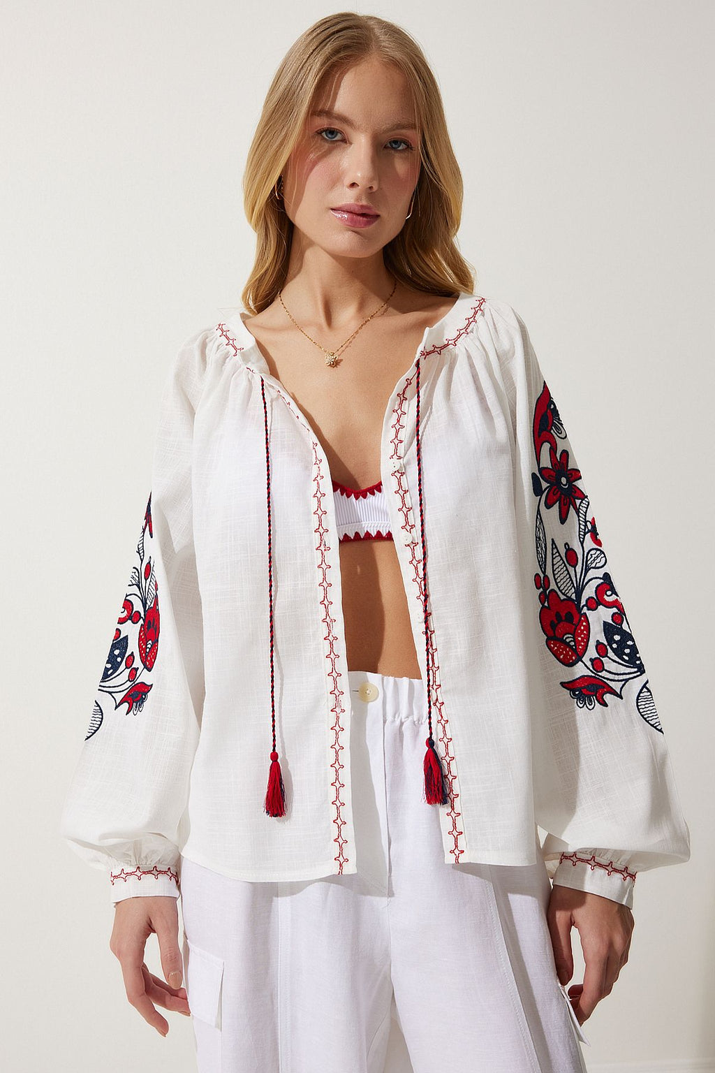 Female white embroidered button flax blouse es00151