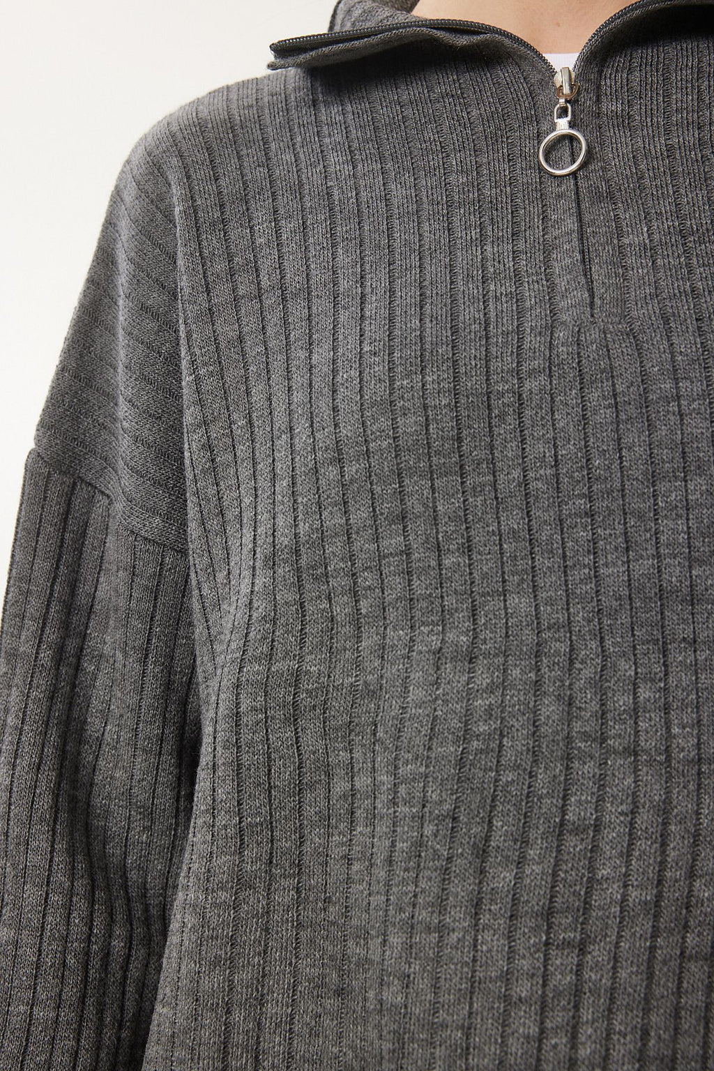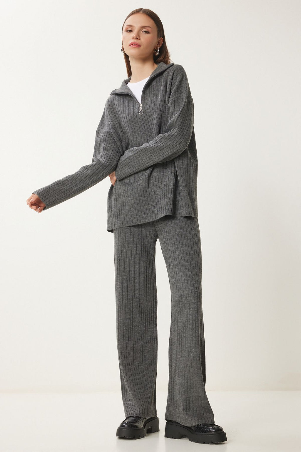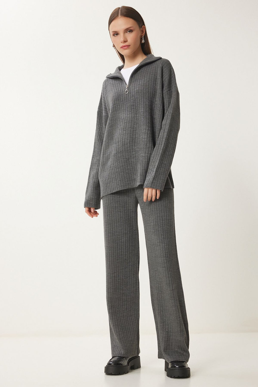 Kadın Antrasit Fermuarlı Fitilli Triko Kazak Pantolon Takım PF00105