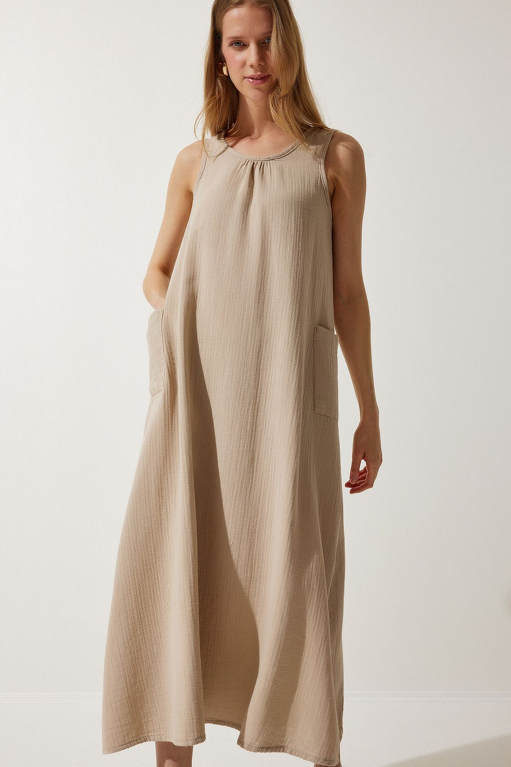 Kadın Bej Geniş Cepli Yazlık Müslin Elbise SA00022