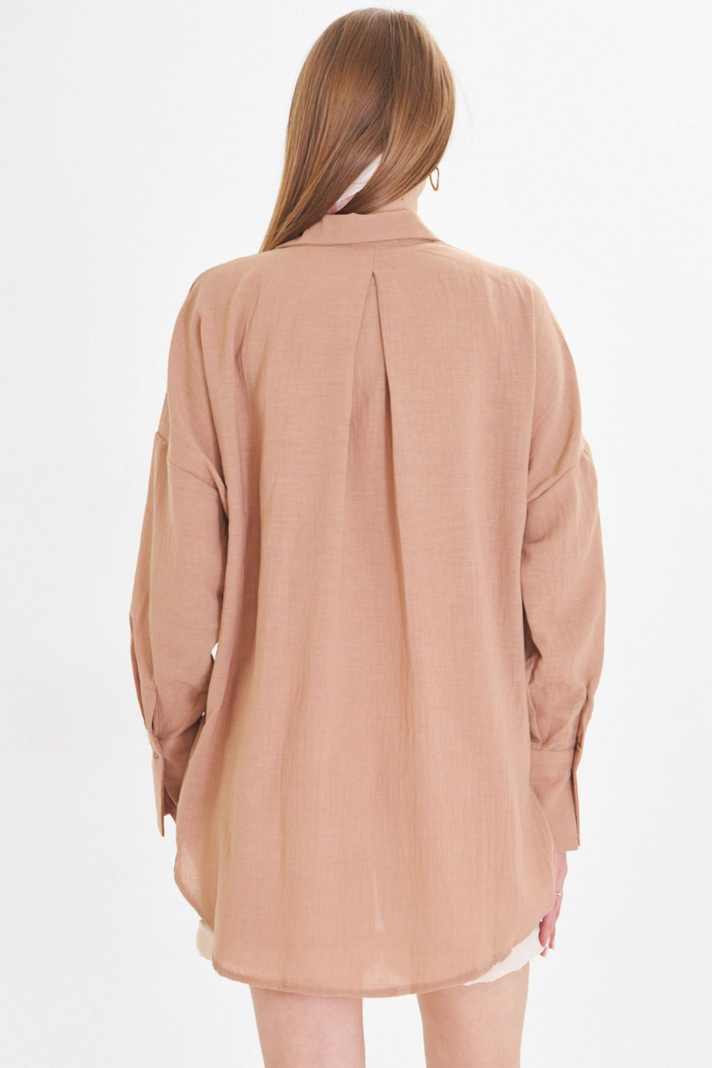 Kadın Bej Oversize Dokulu Keten Görünümlü Geniş Manşetli Gömlek ARM-24K001001
