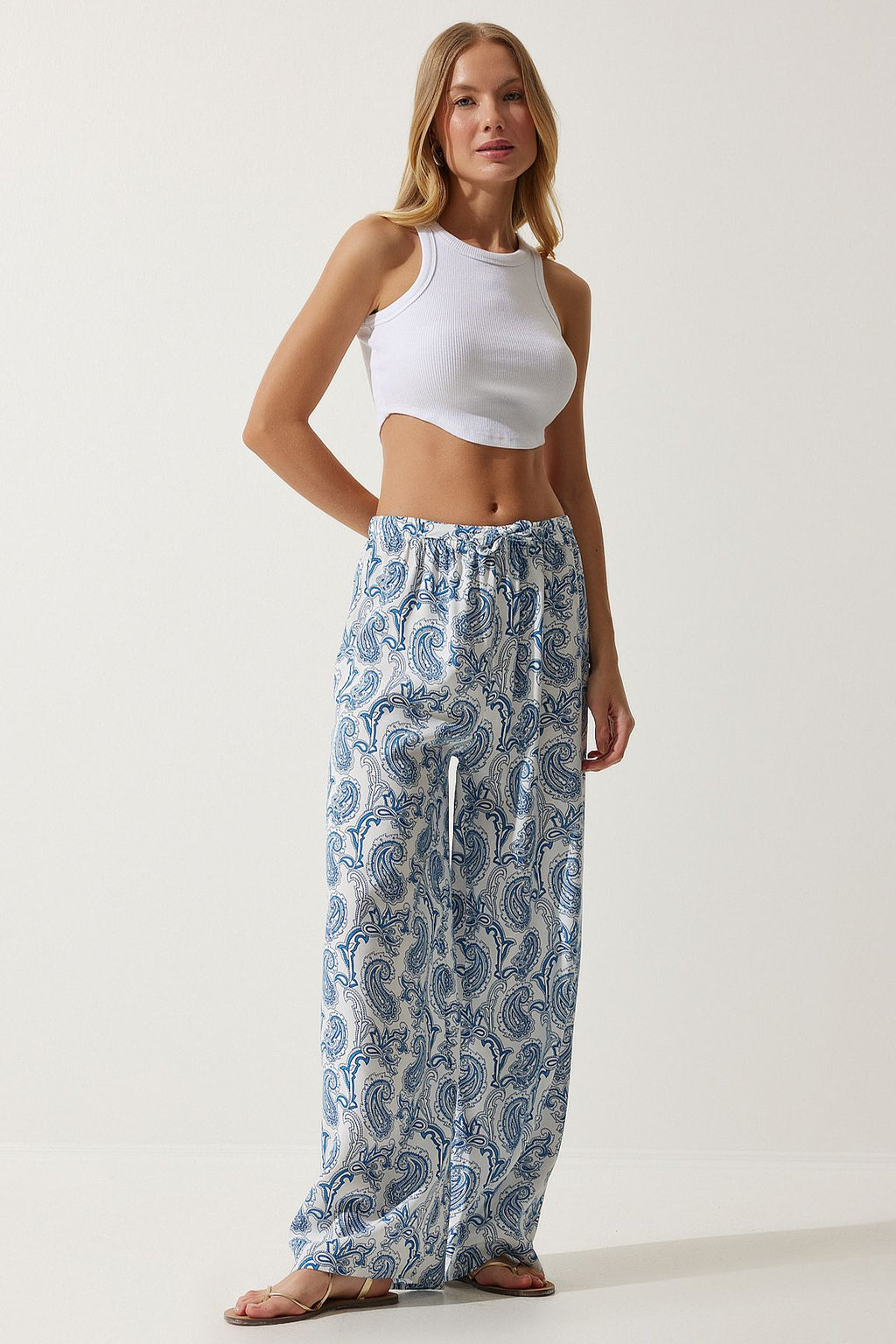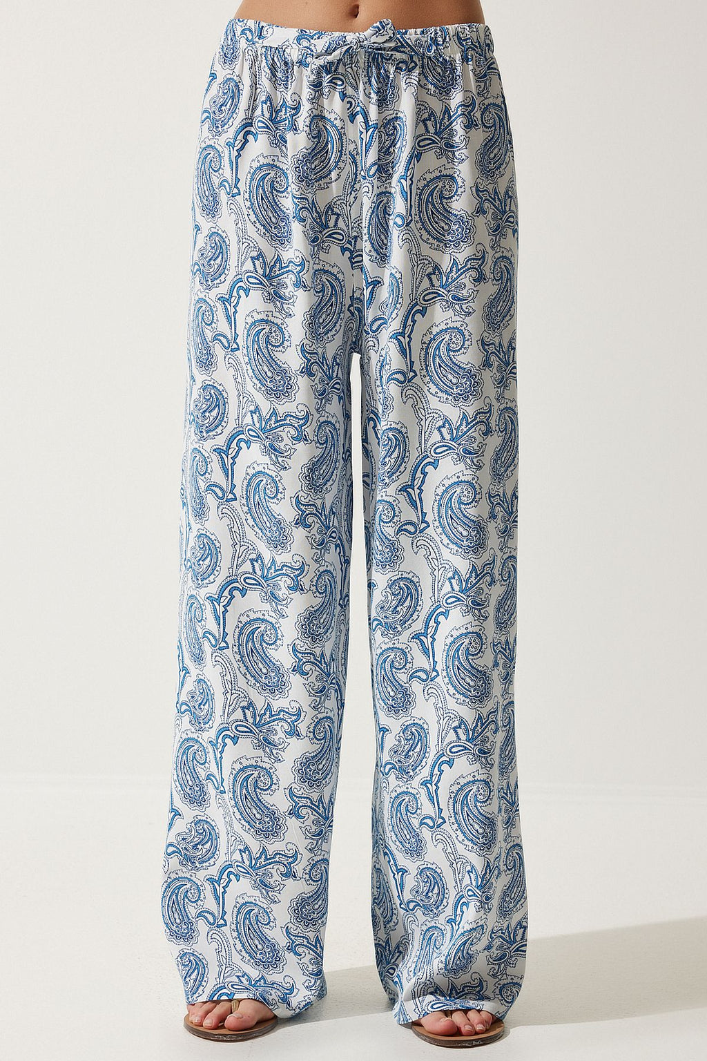 Kadın Beyaz Açık Mavi Desenli Ham Keten Palazzo Pantolon BH00397