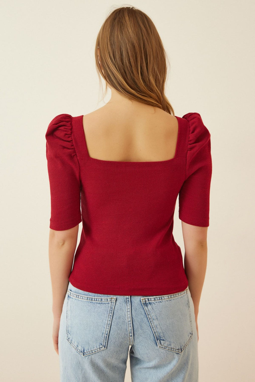 Kadın Bordo Kare Yaka Fitilli Crop Bluz GT00007