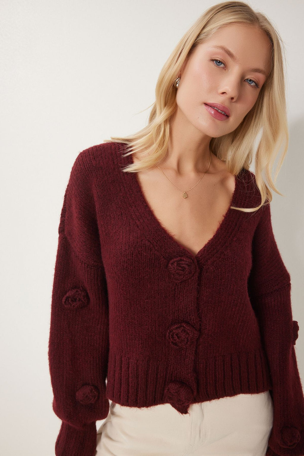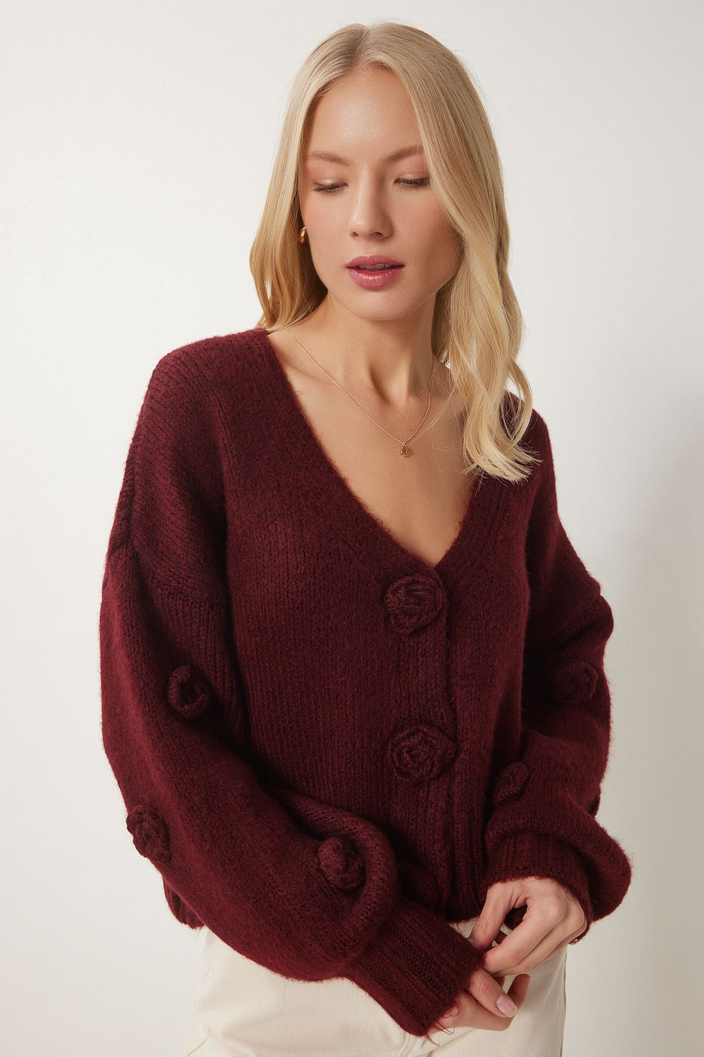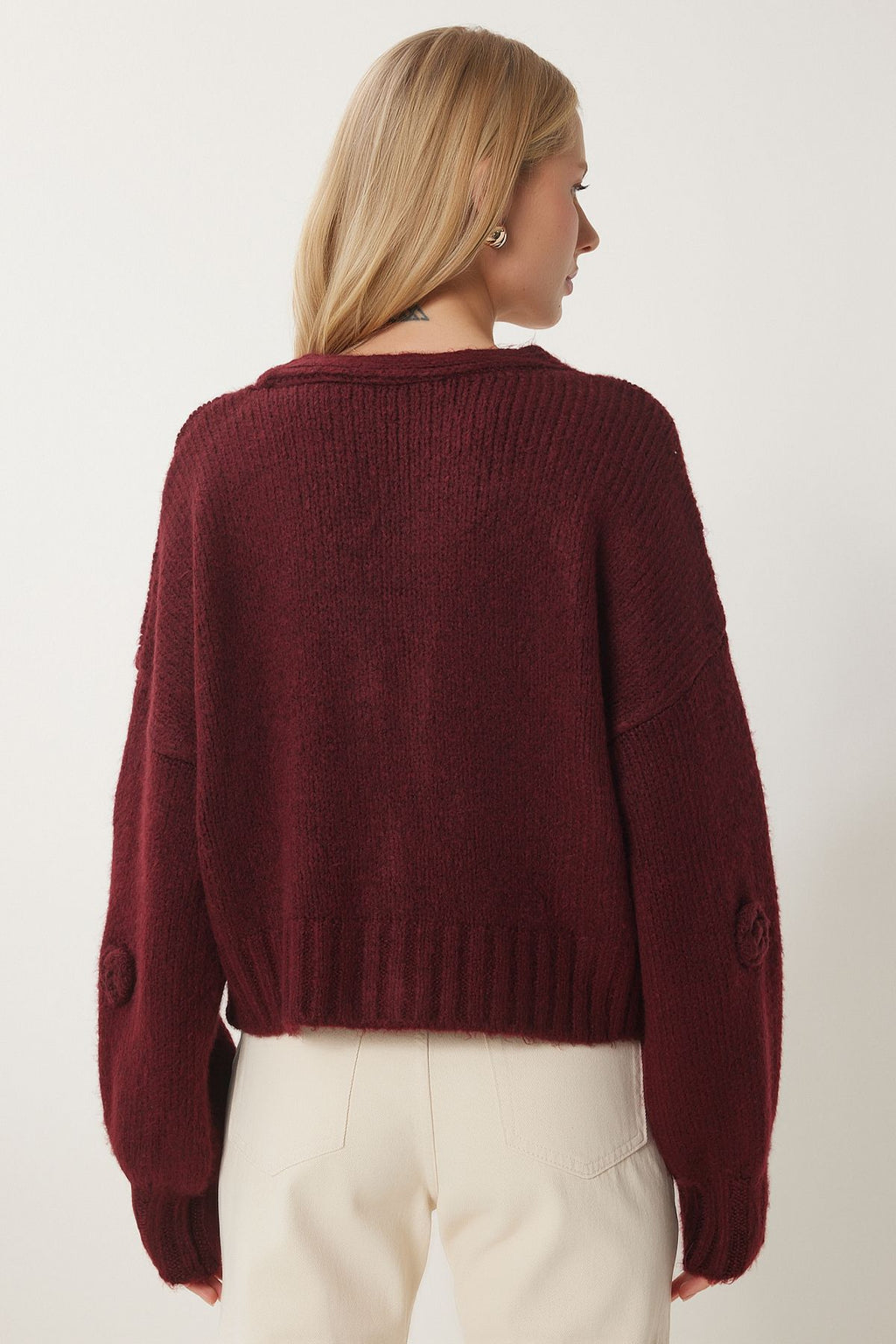 Kadın Bordo Ponpon Çiçek Detaylı Triko Hırka PF00078