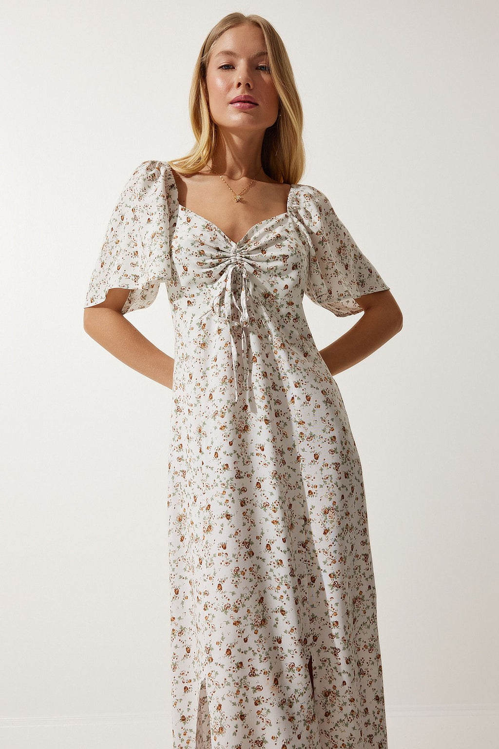 Kadın Ekru Yırtmaç Detaylı Volanlı Viskon Elbise UB00247