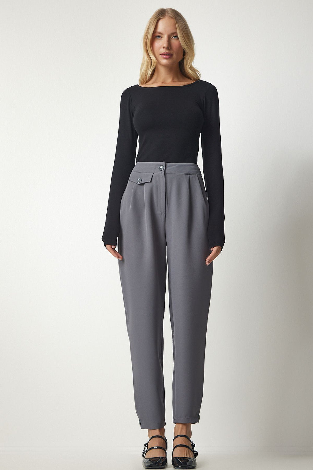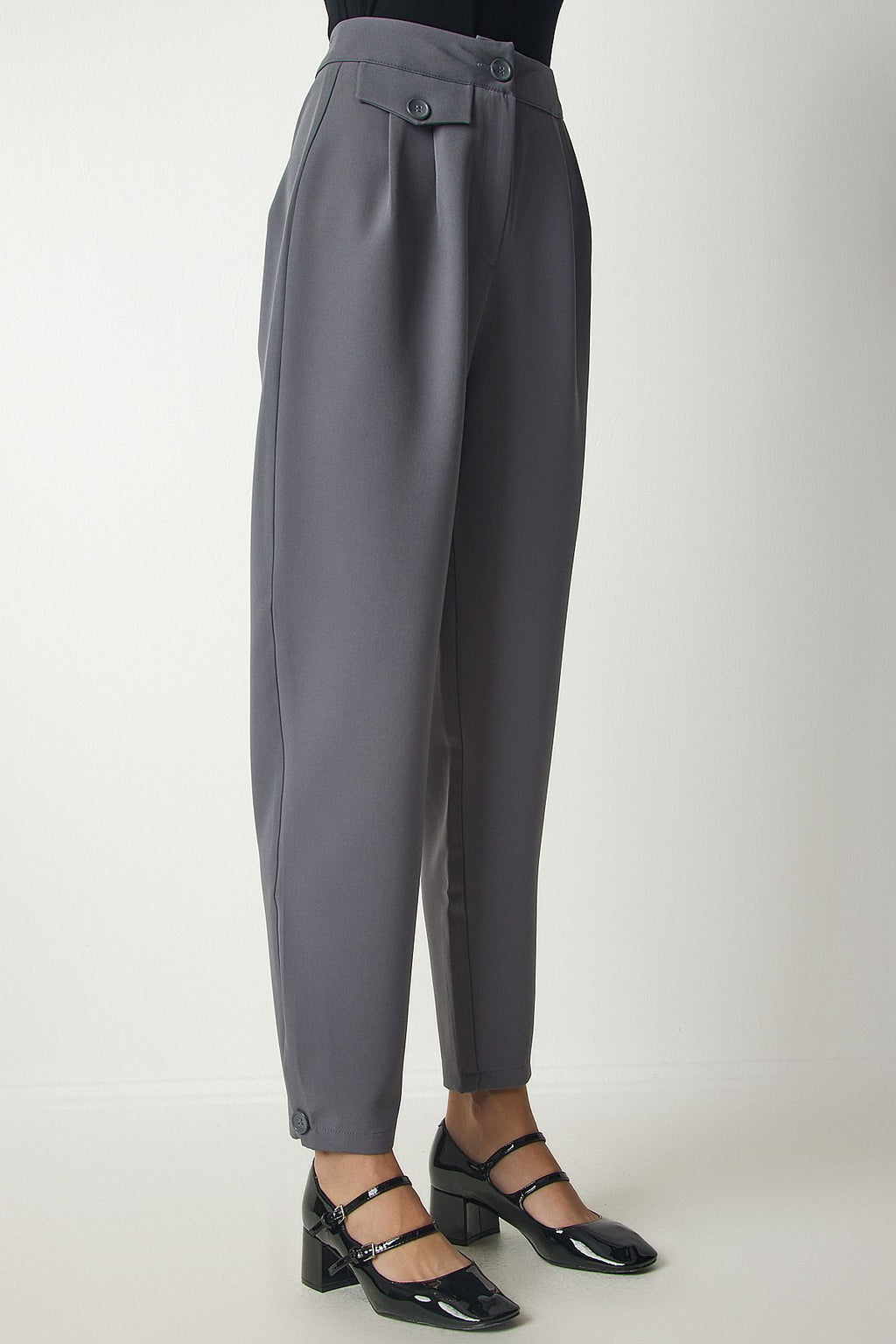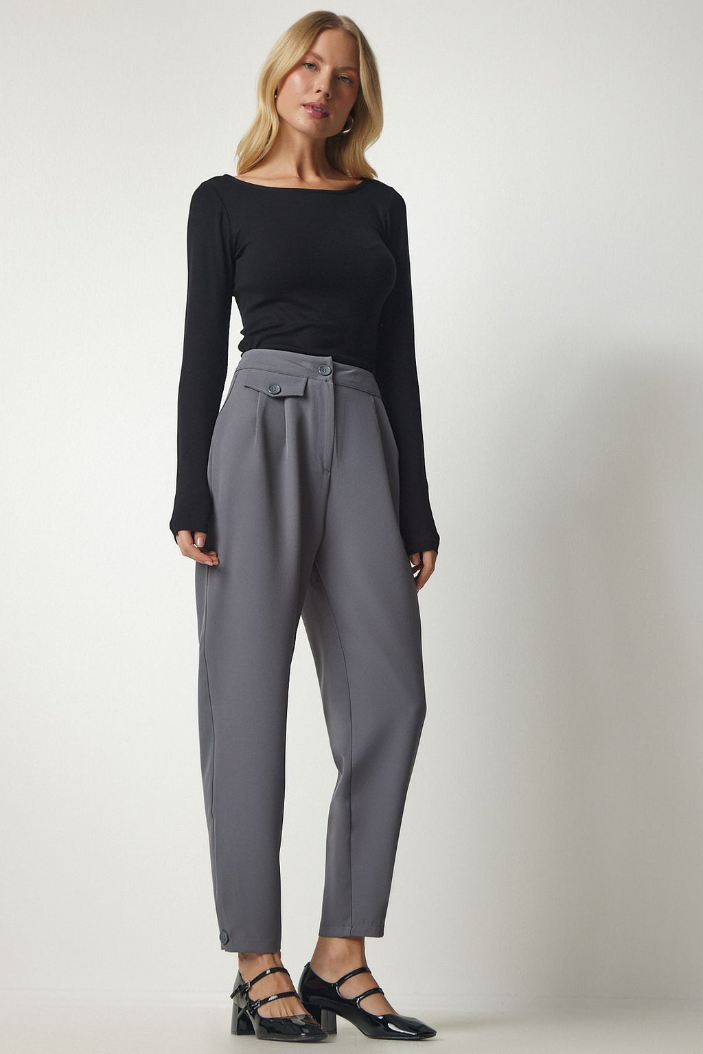 Kadın Gri Paçası Düğmeli Şık Dokuma Pantolon GK00012