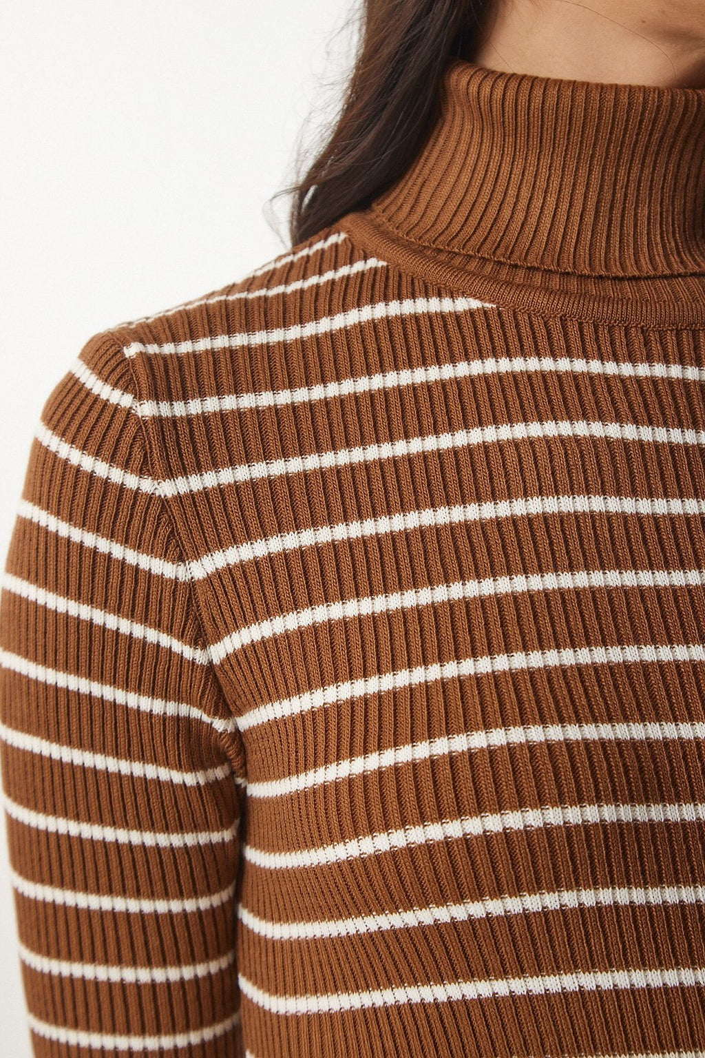 Kadın Kahverengi Çizgili Balıkçı Yaka Triko Kazak BP00146