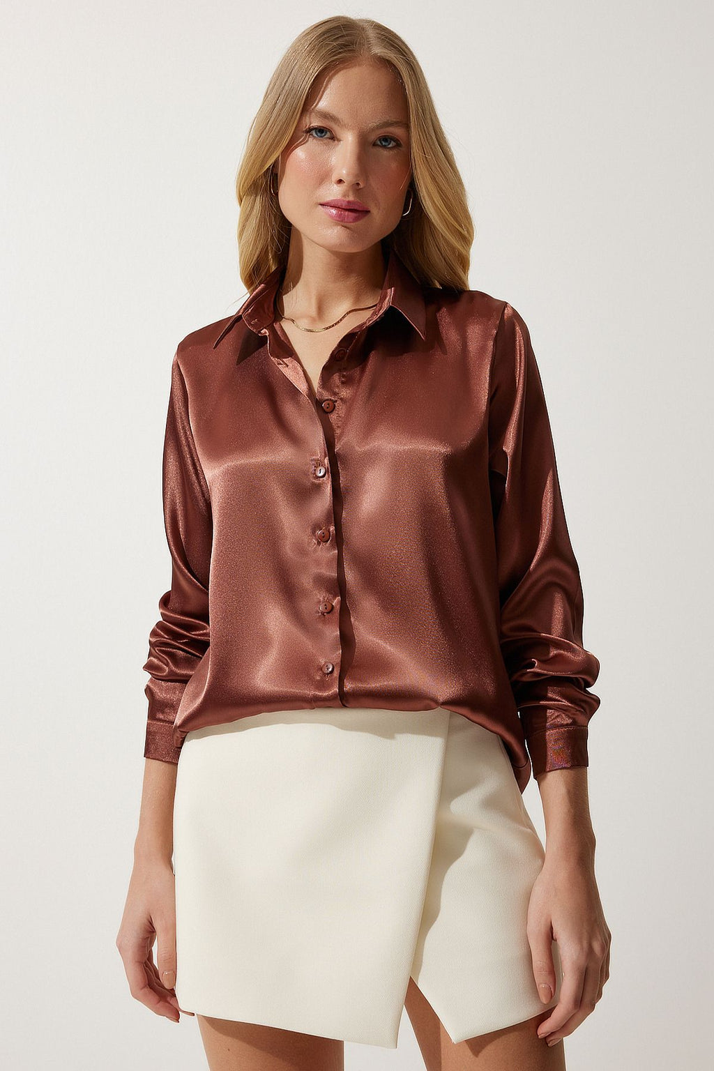 Kadın Kahverengi Hafif Dökümlü Saten Yüzeyli Gömlek DD00990