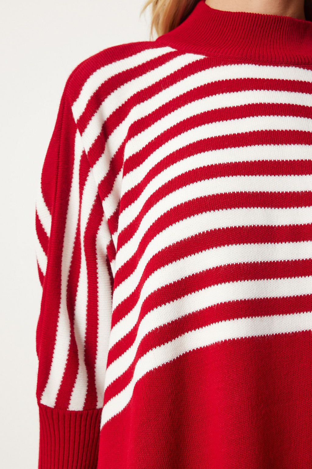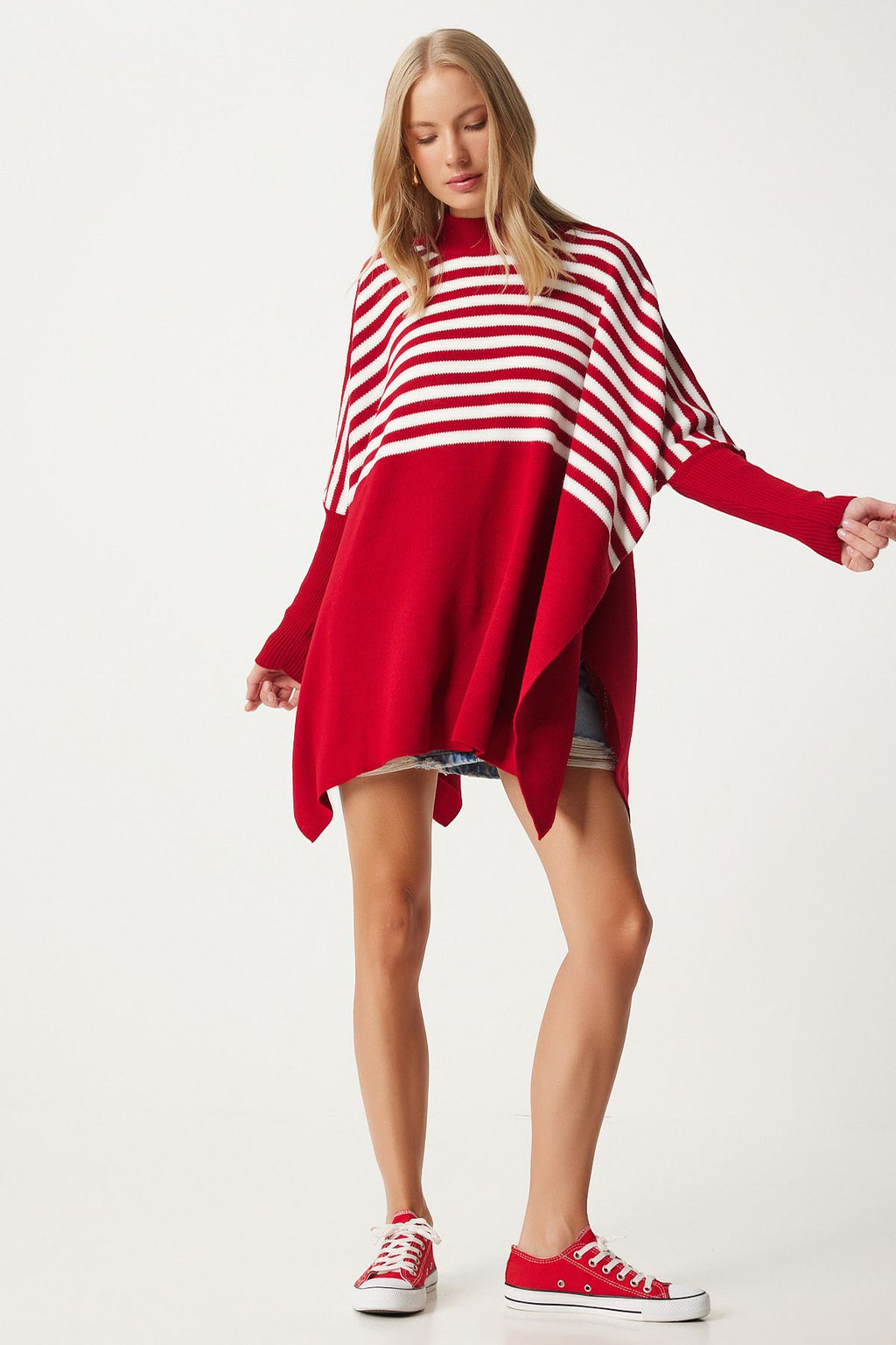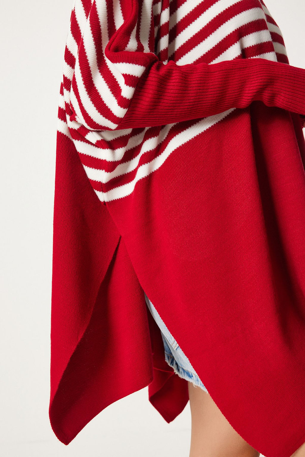 Kadın Kırmızı Çizgili Yandan Yırtmaçlı Oversize Panço Kazak DD01336