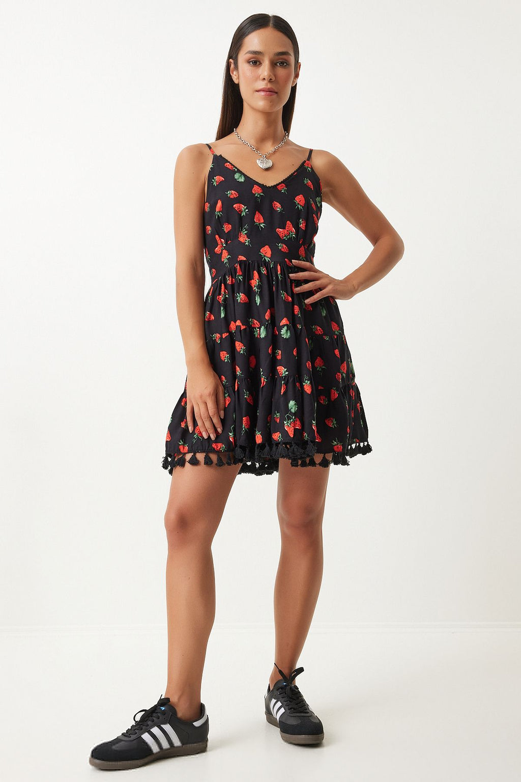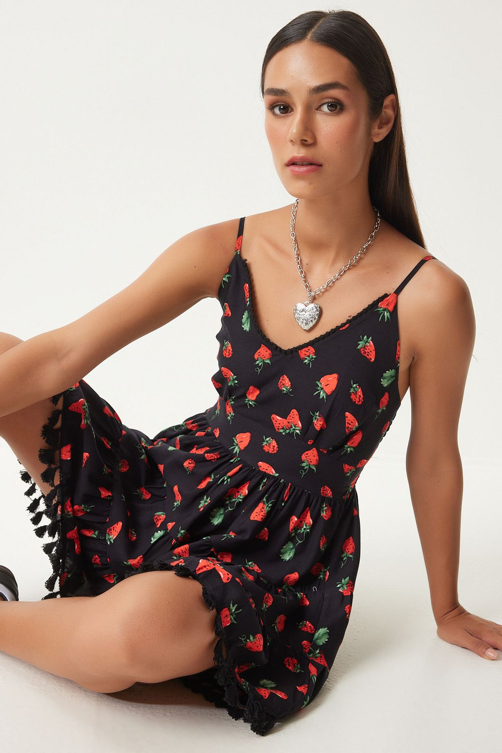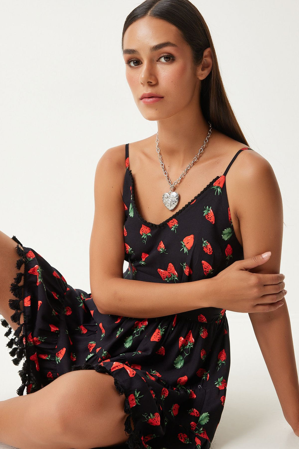 Kadın Kırmızı Siyah Desenli Askılı Yazlık Viskon Elbise FN03203