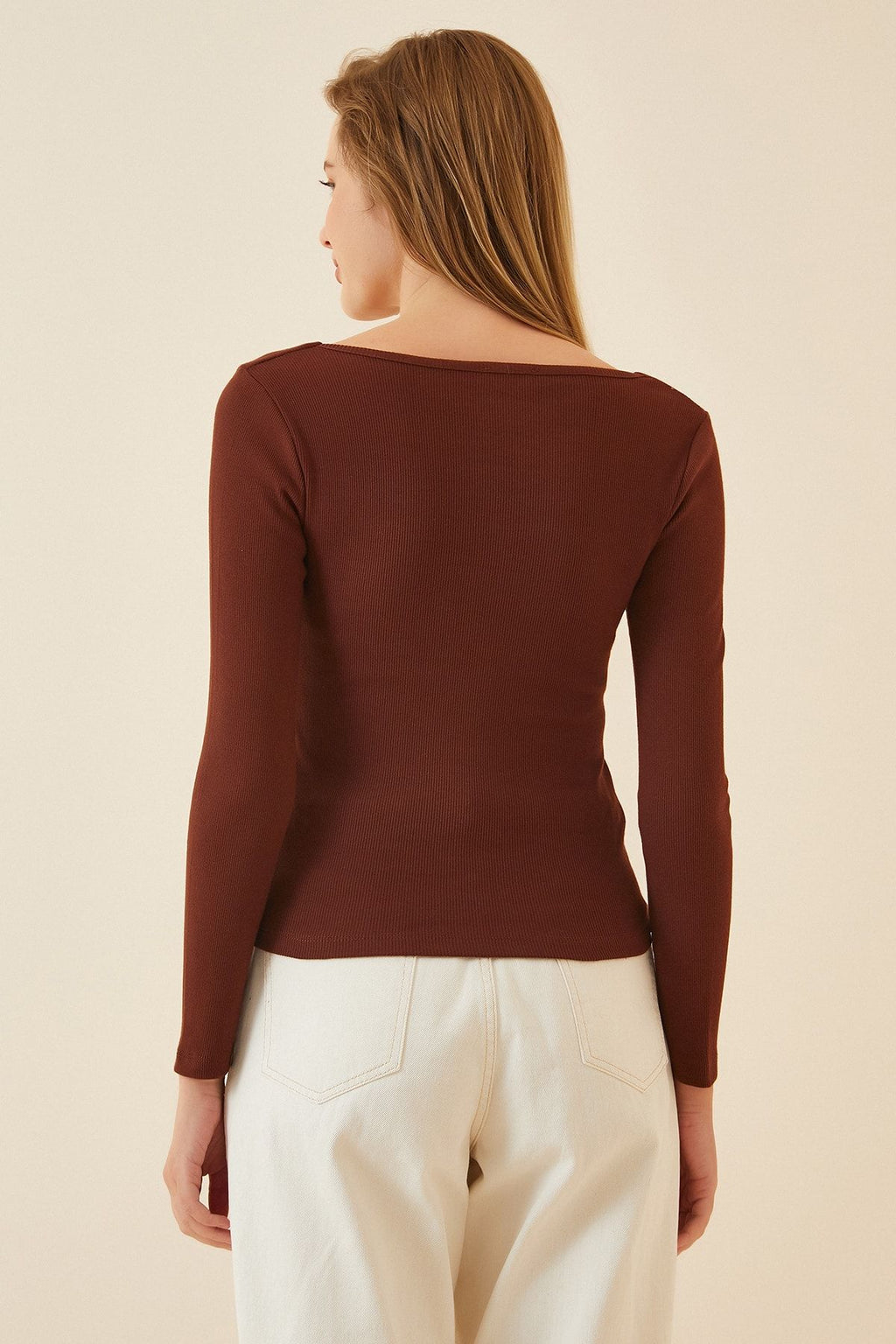 Kadın Koyu Kahverengi Kare Yaka Fitilli Örme Bluz GT00052