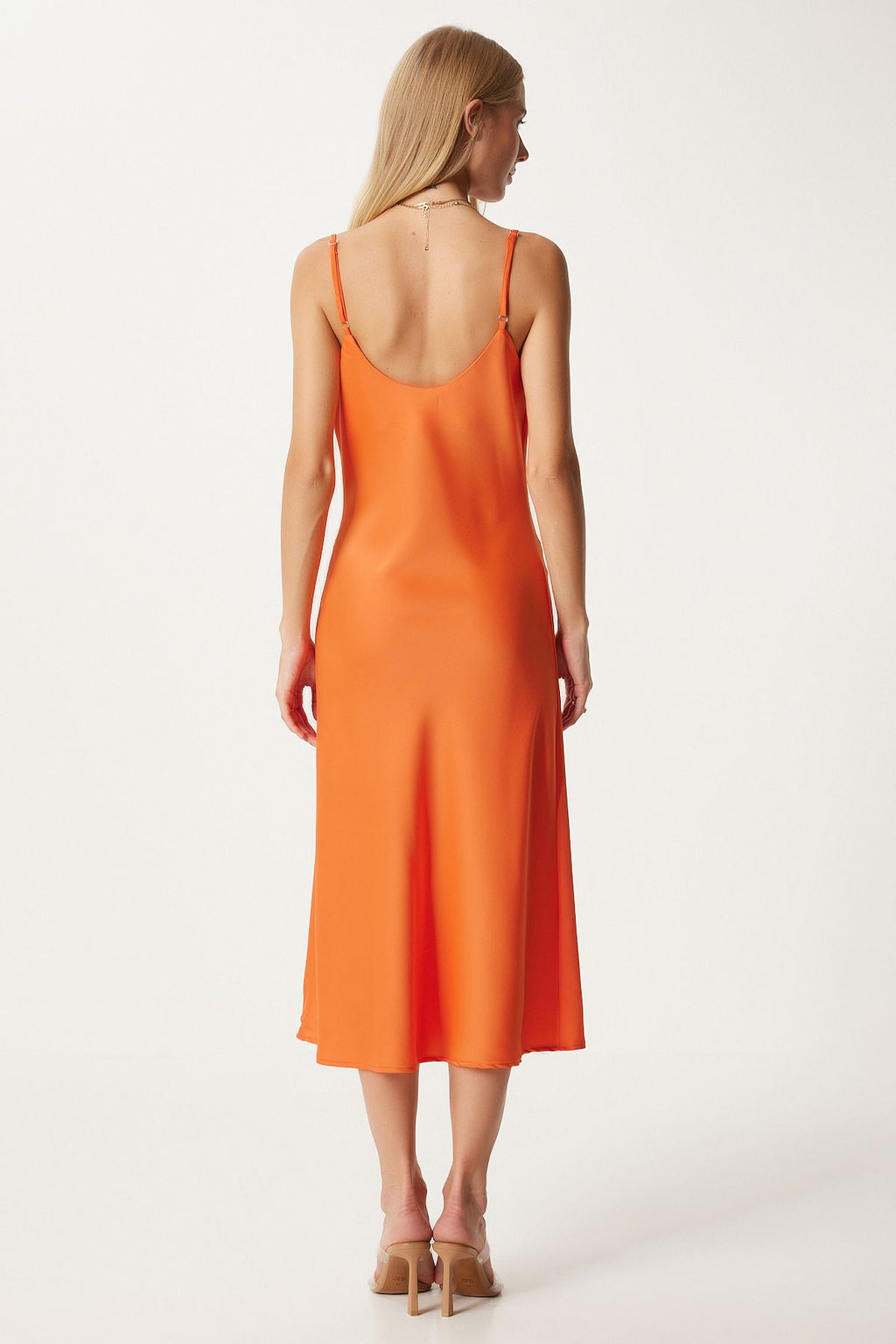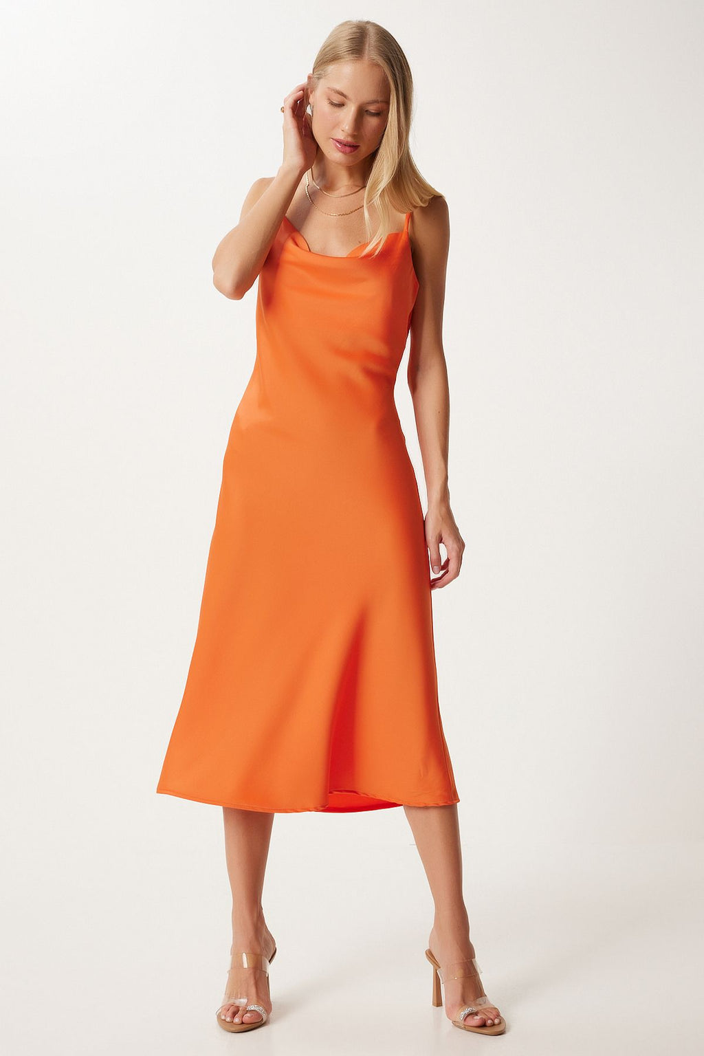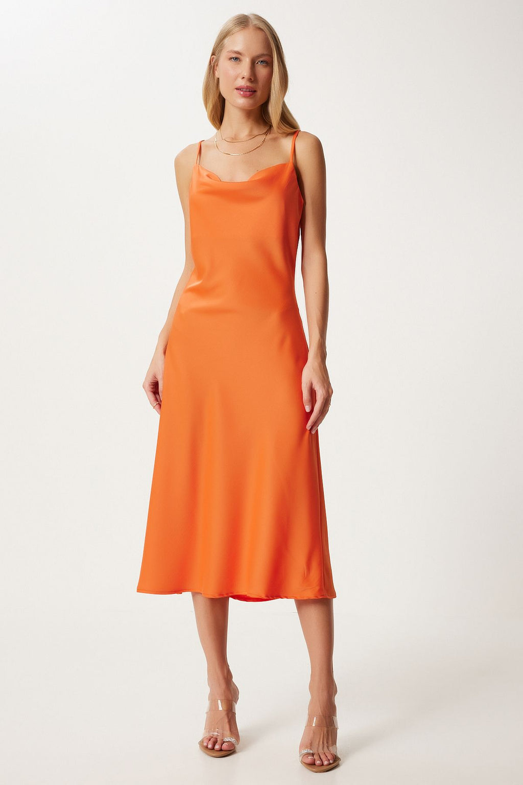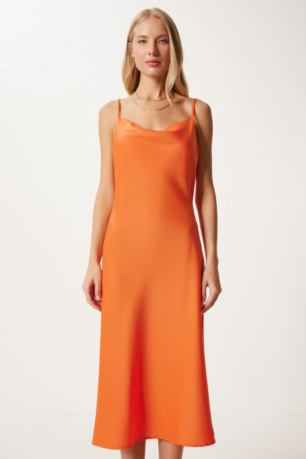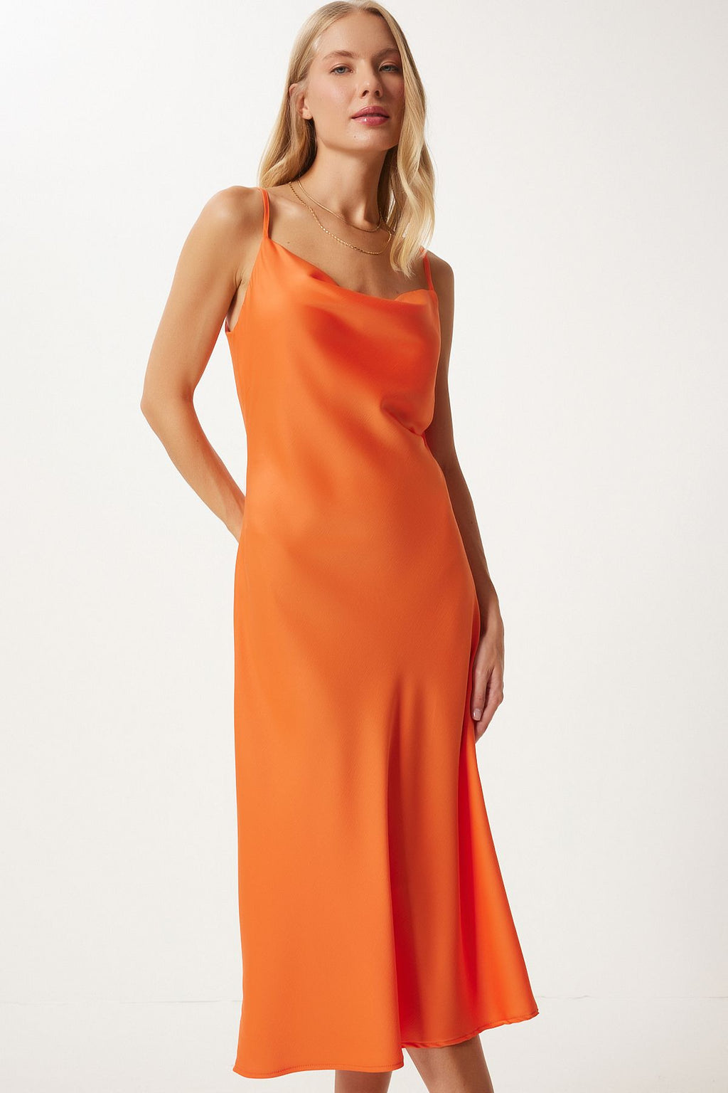 Kadın Koyu Oranj Degaje Yaka Saten Yüzeyli Elbise FN03300