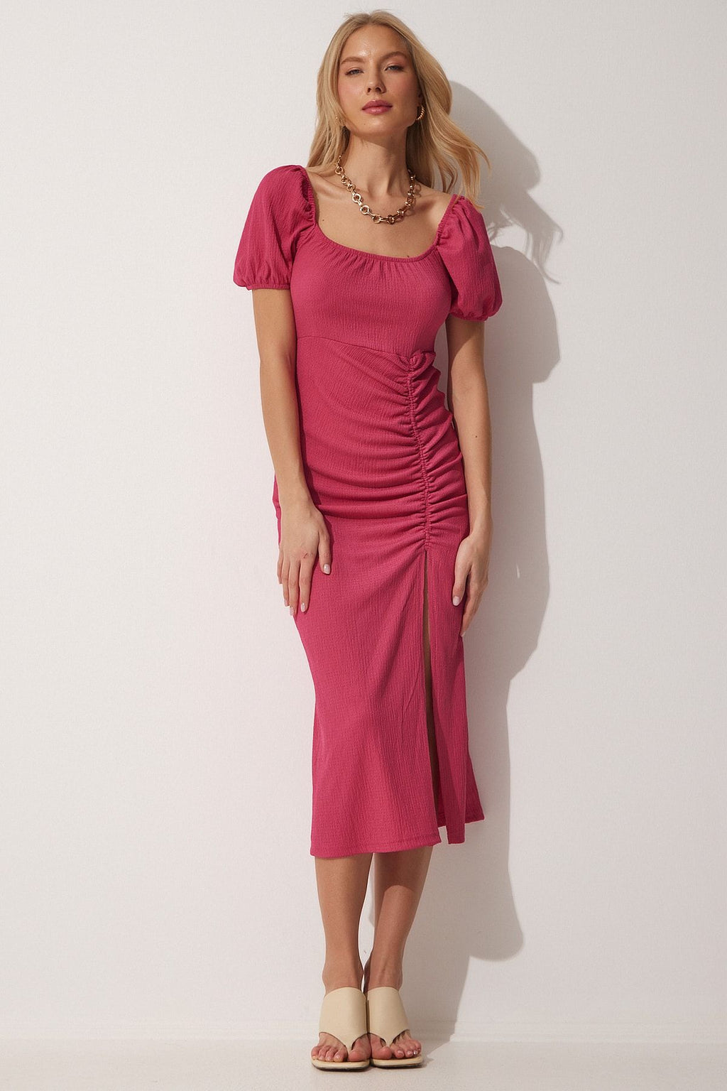 Kadın Koyu Pembe Büzgülü Saran Yazlık Örme Elbise DD01202