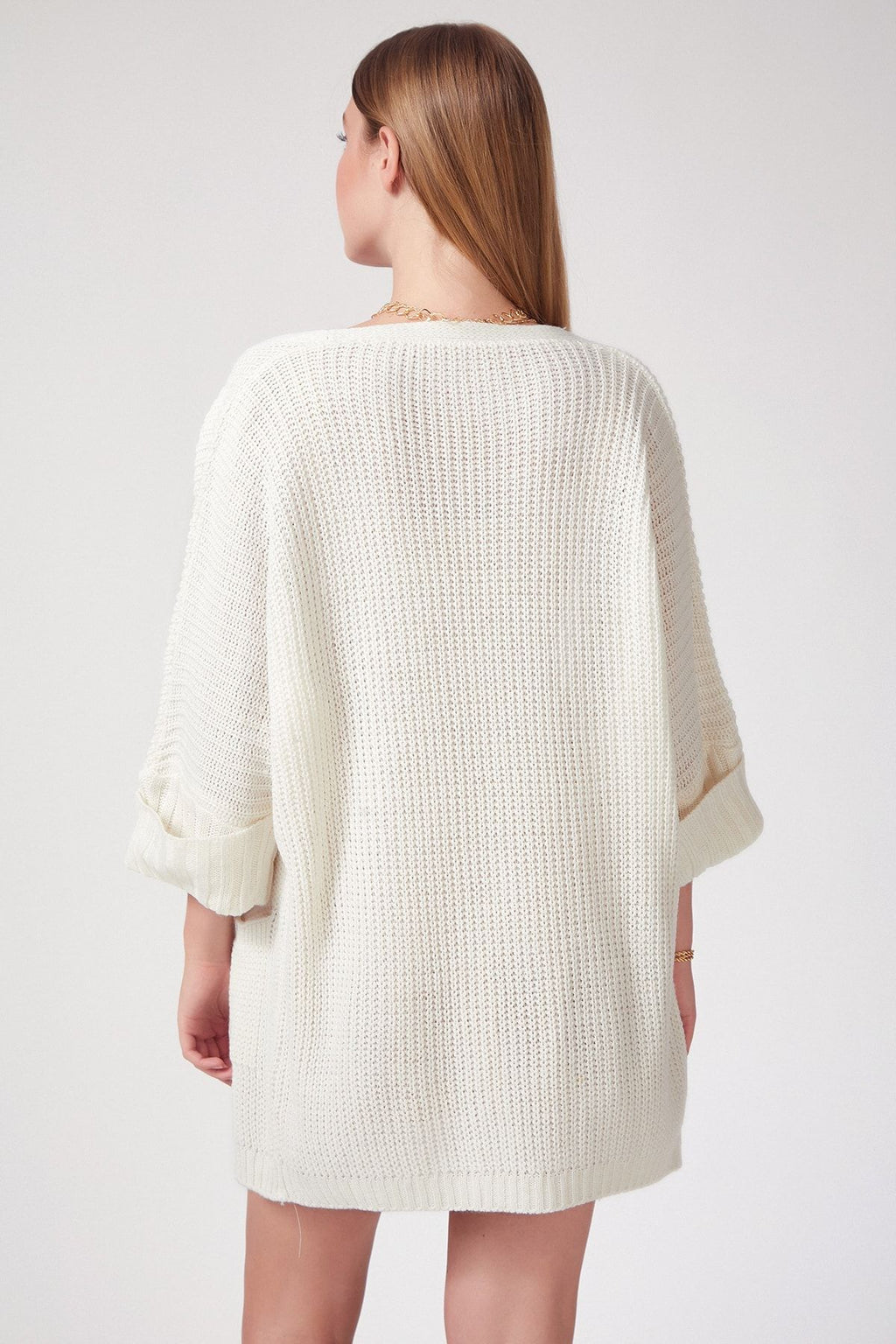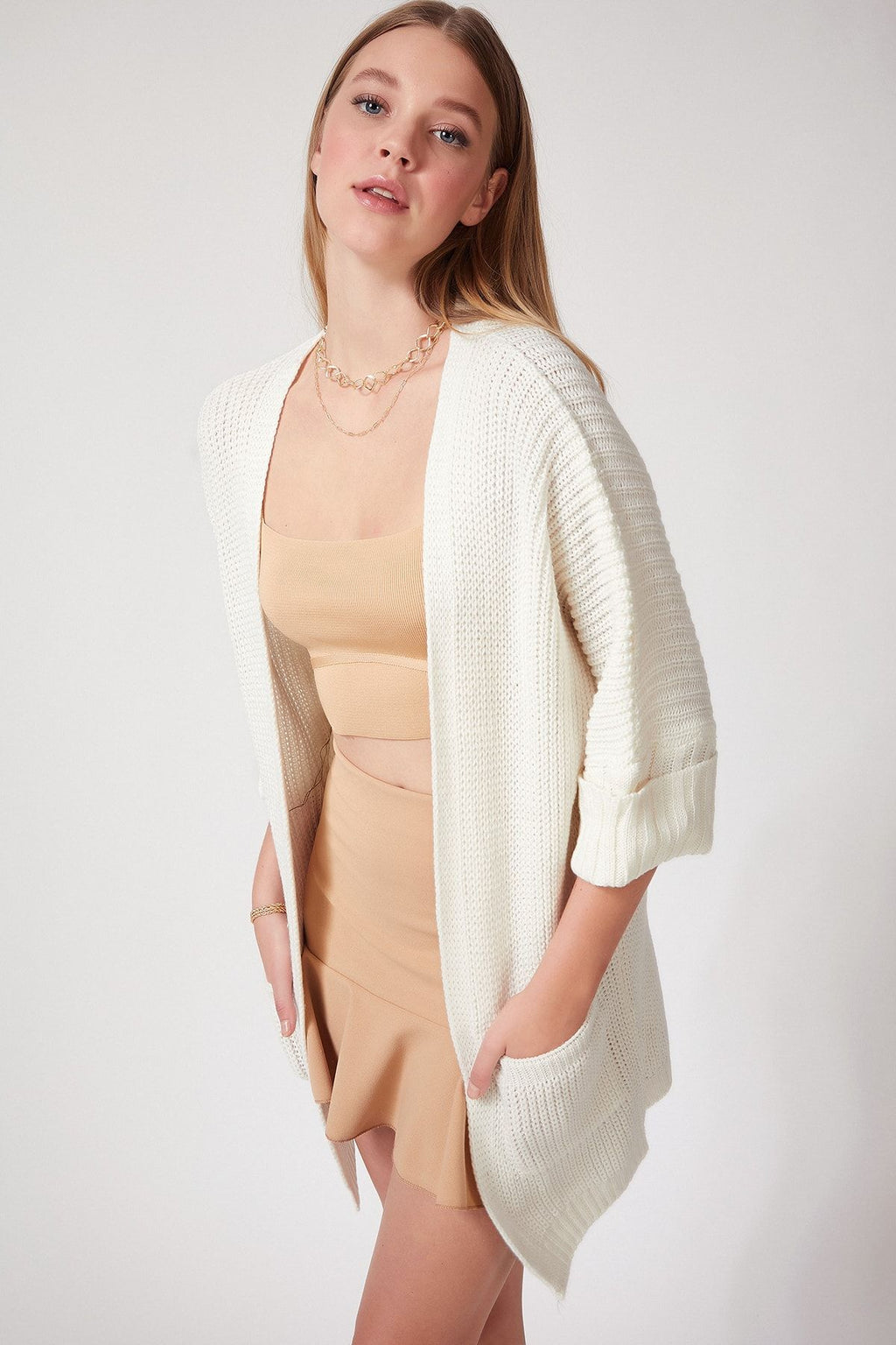 Kadın Kremsi Beyaz Oversize Uzun Cepli Triko Hırka AS00003