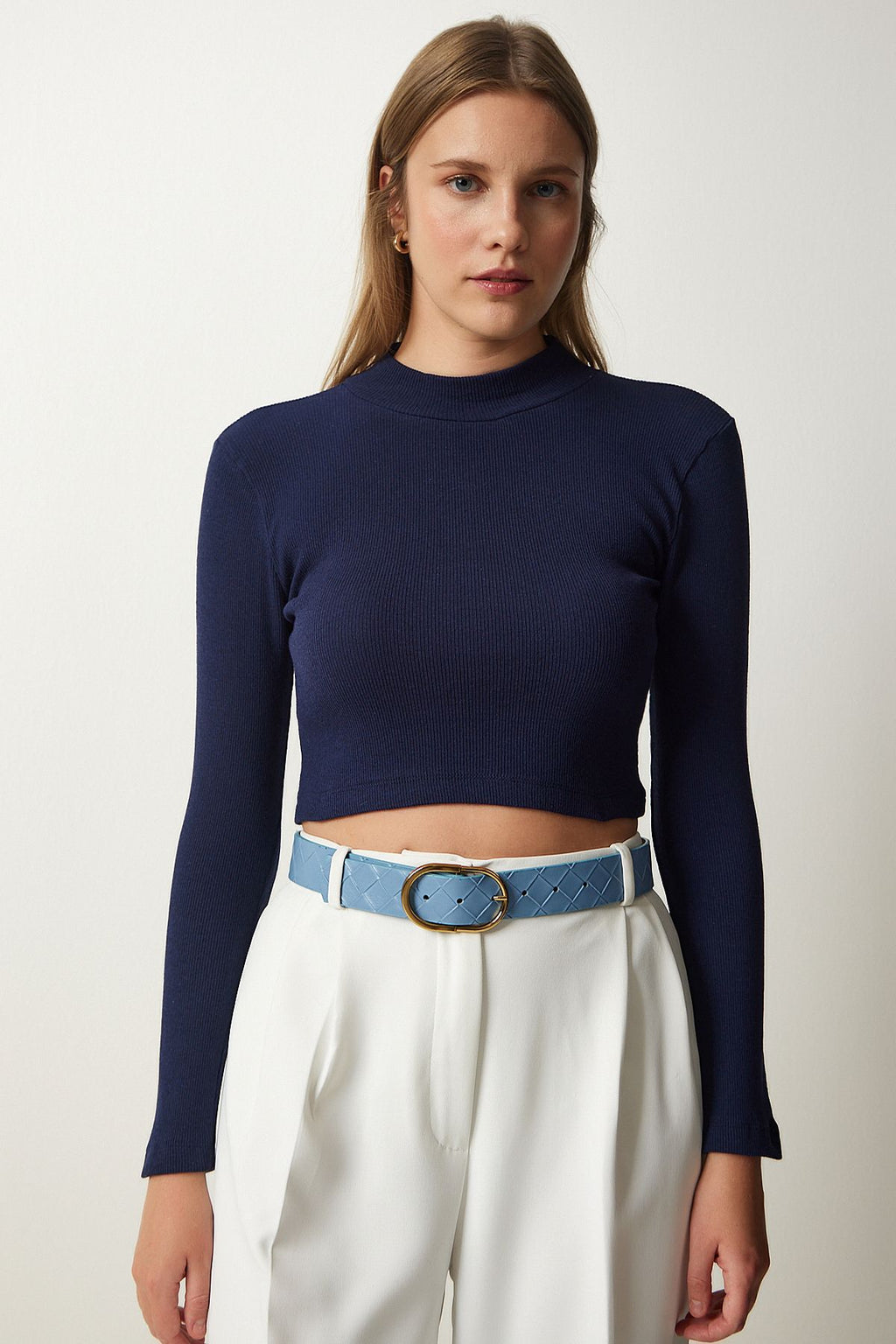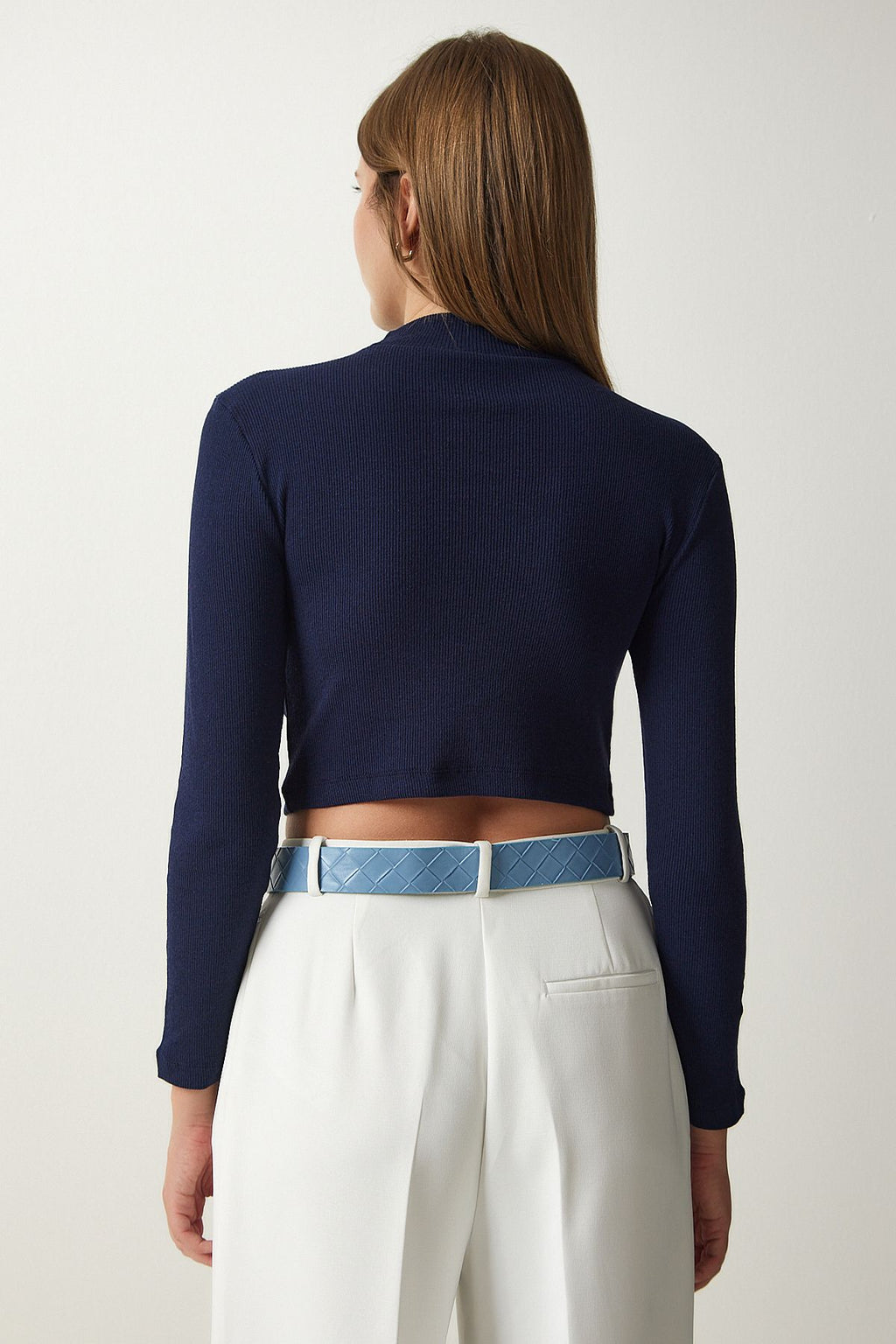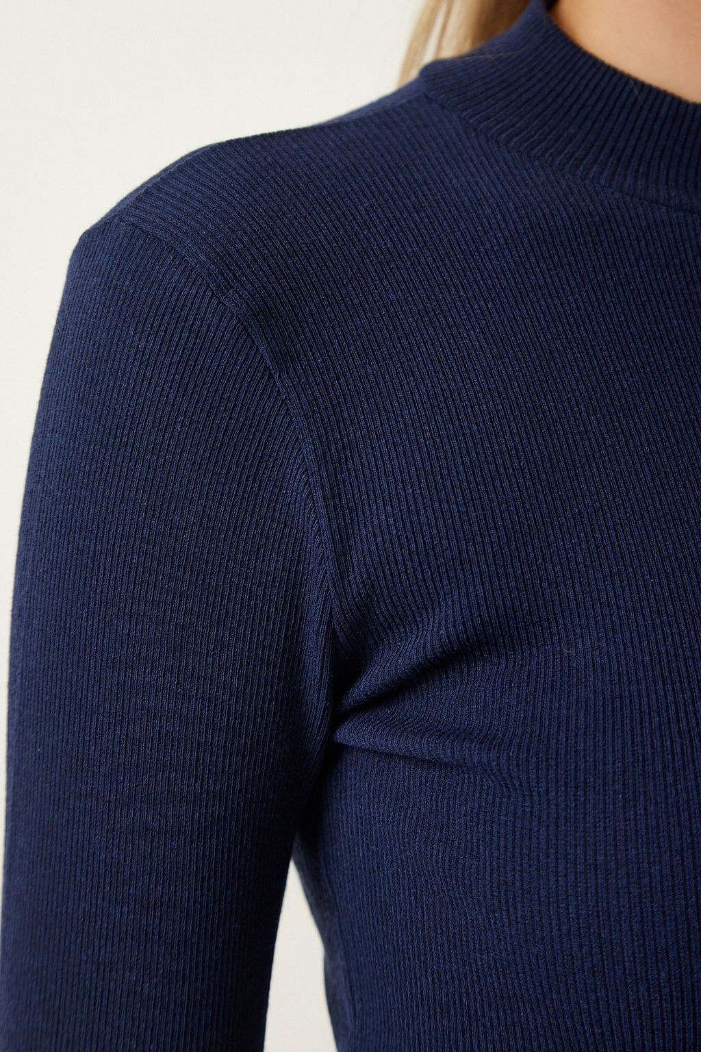 Kadın Lacivert Fitilli Balıkçı Yaka Crop Örme Bluz GT00059