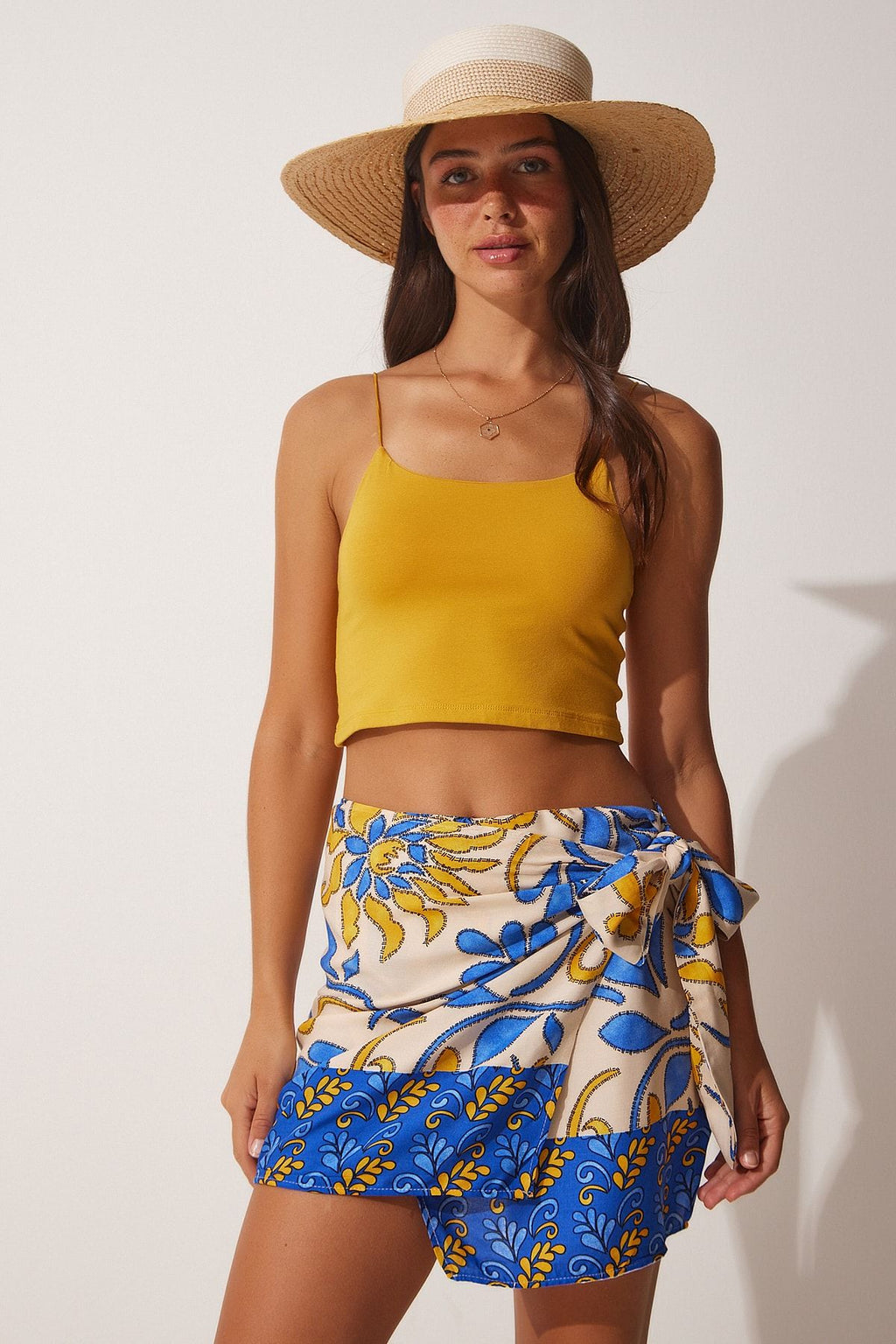 Kadın Mavi Bej Desenli Bağlamalı Mini Viskon Etek FN03063