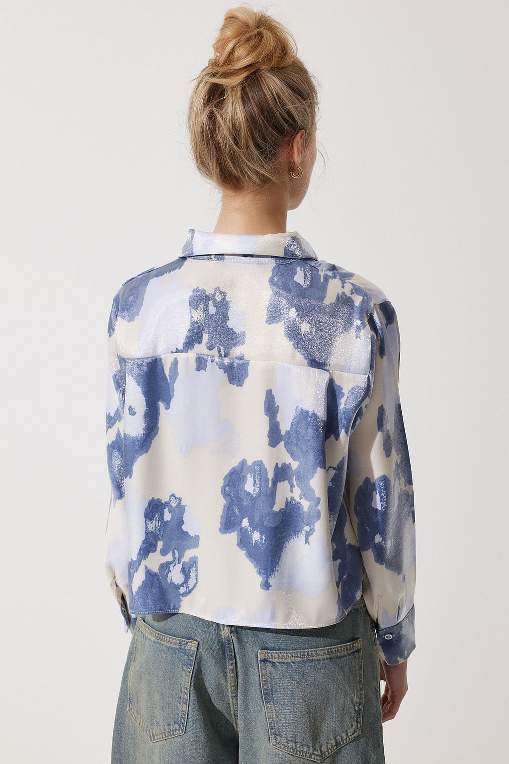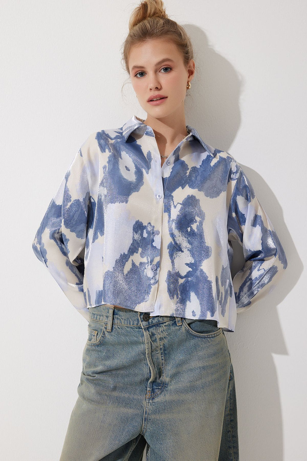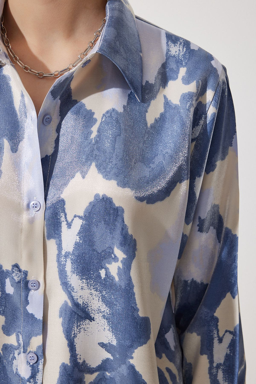 Kadın Mavi Desenli Saten Yüzeyli Kısa Gömlek CR00435