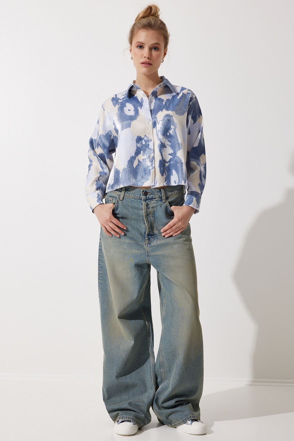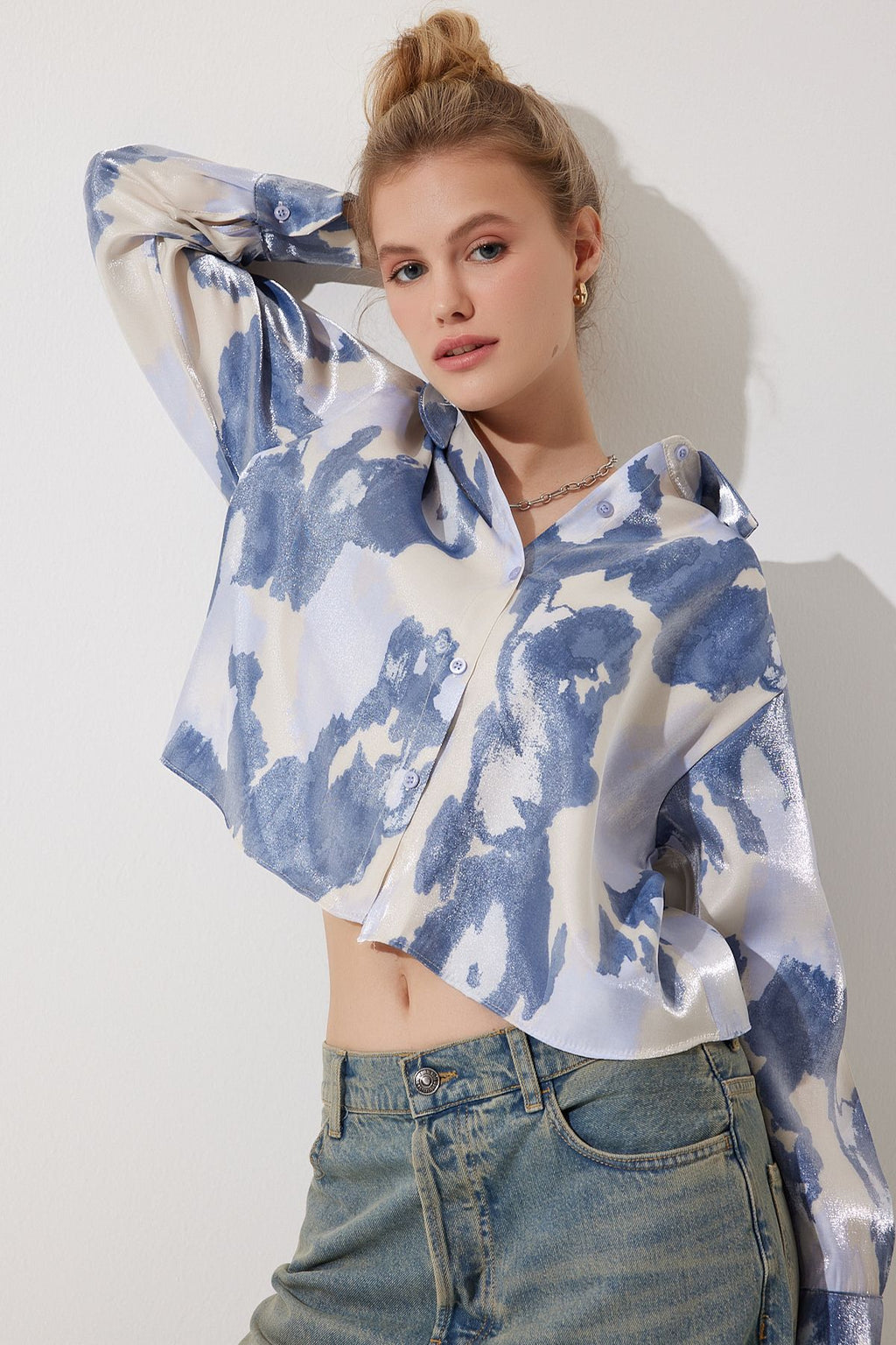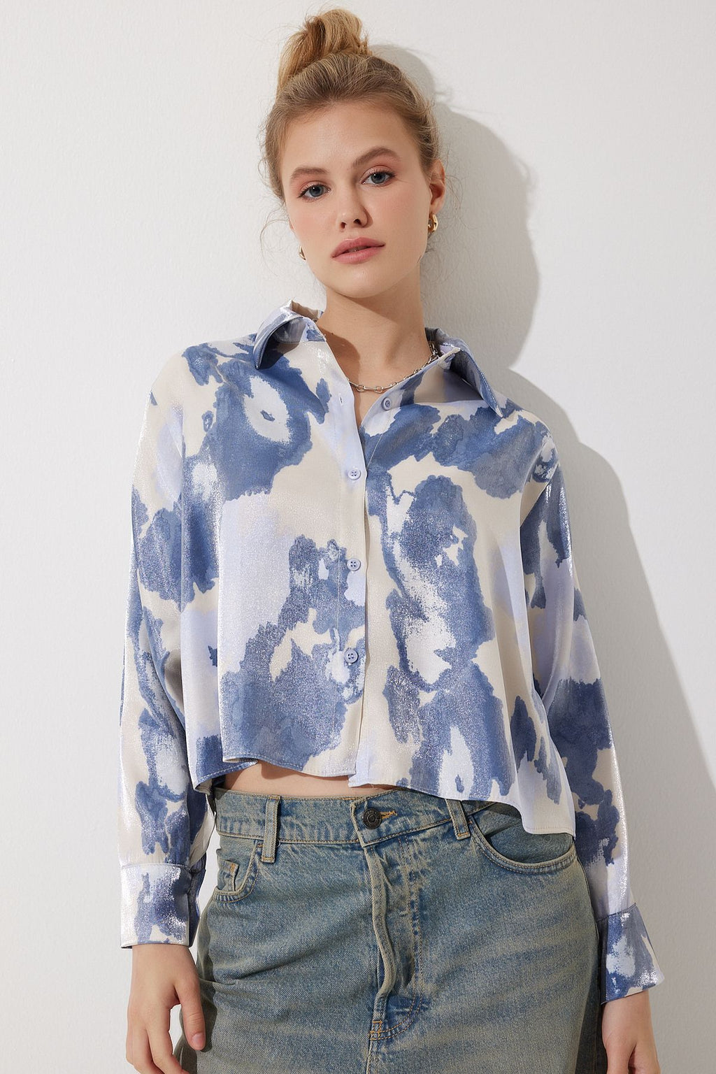 Kadın Mavi Desenli Saten Yüzeyli Kısa Gömlek CR00435