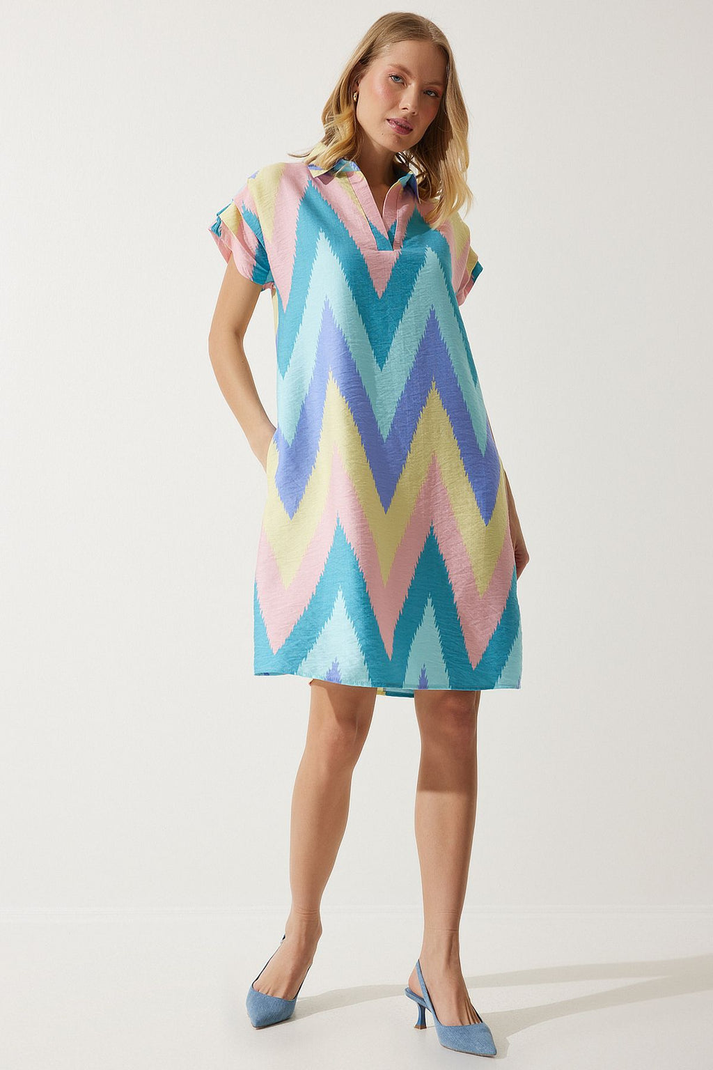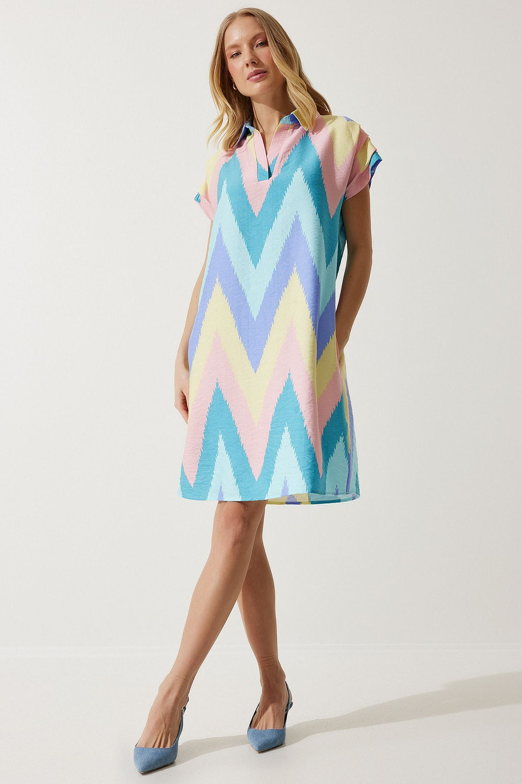 Kadın Pudra Mavi Polo Yaka Desenli Yazlık Elbise OF00001