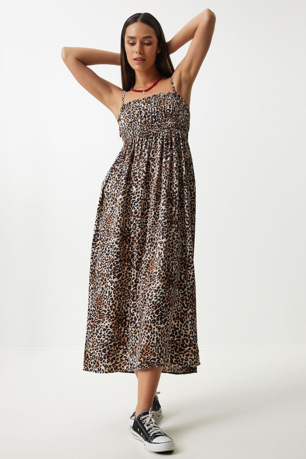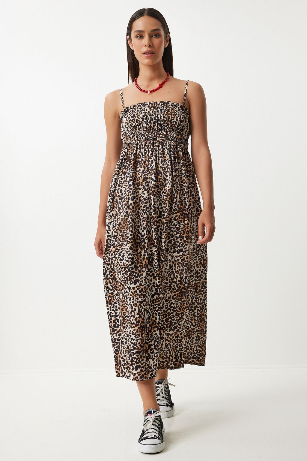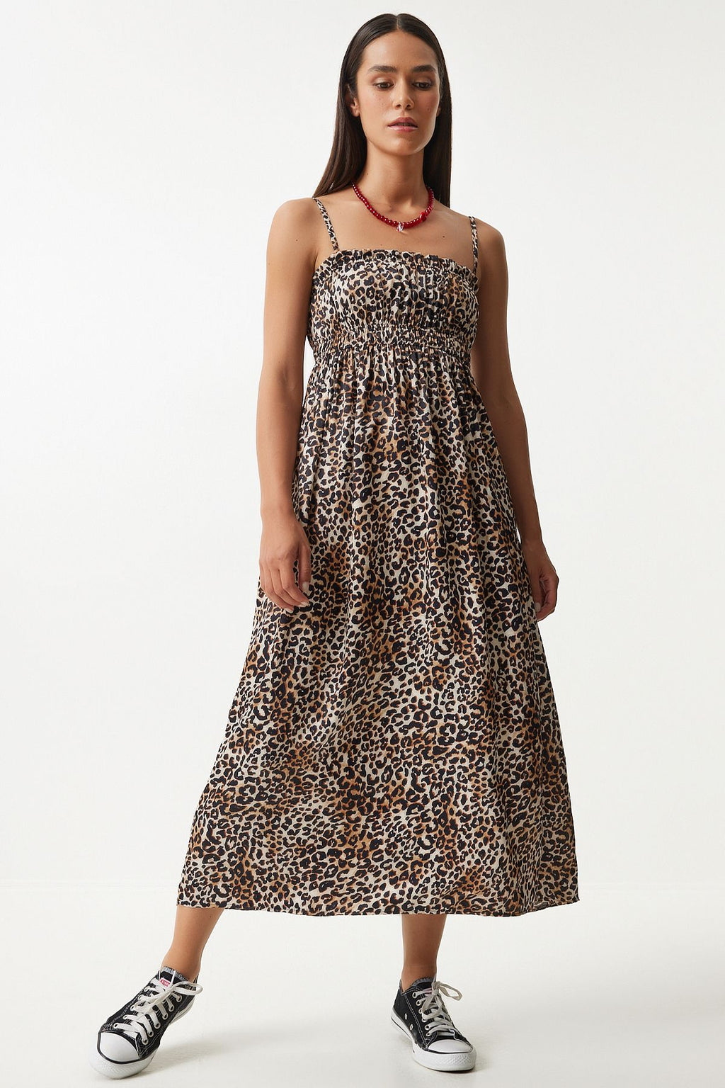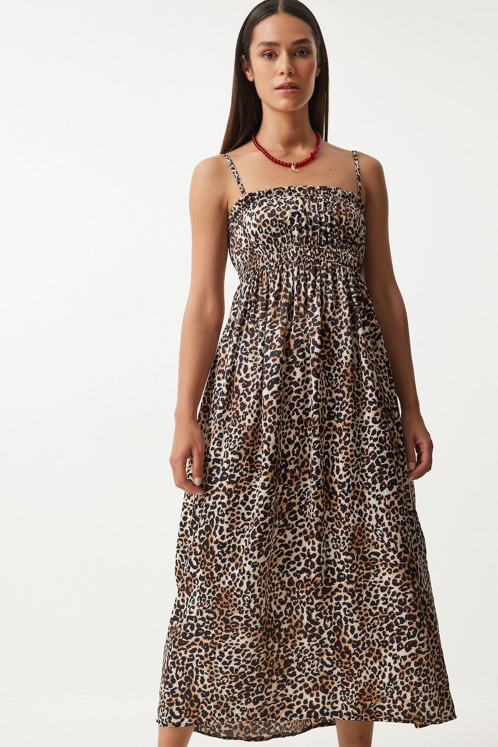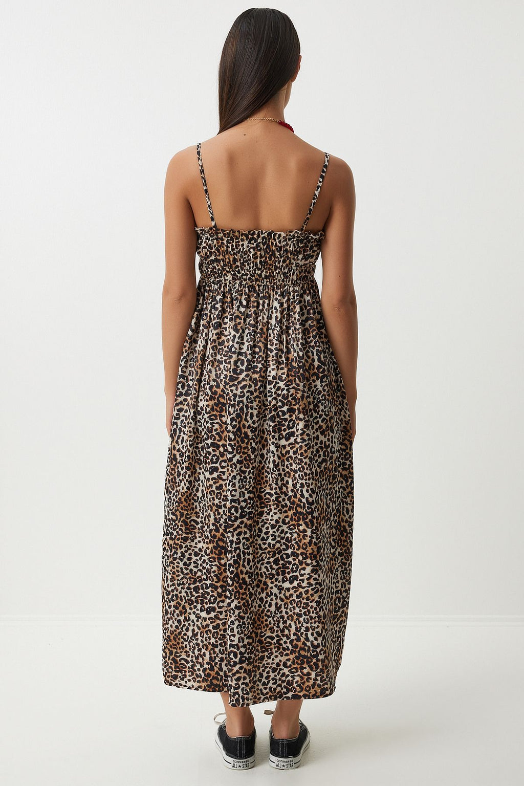 Kadın Siyah Bej Leopar Desenli Askılı Viskon Elbise UB00287