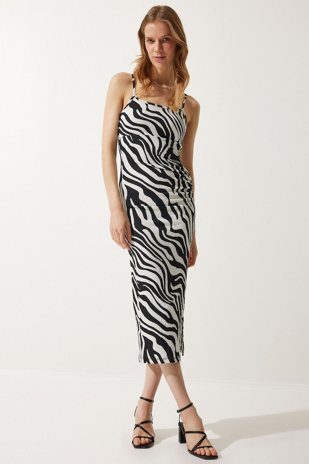 Kadın Siyah Beyaz Desenli Büzgülü Yazlık Örme Elbise FF00158