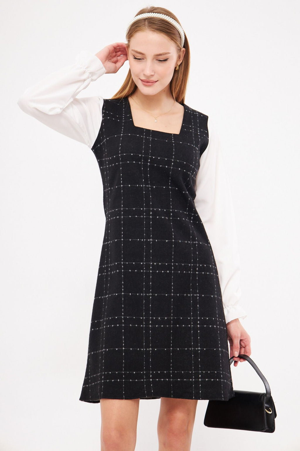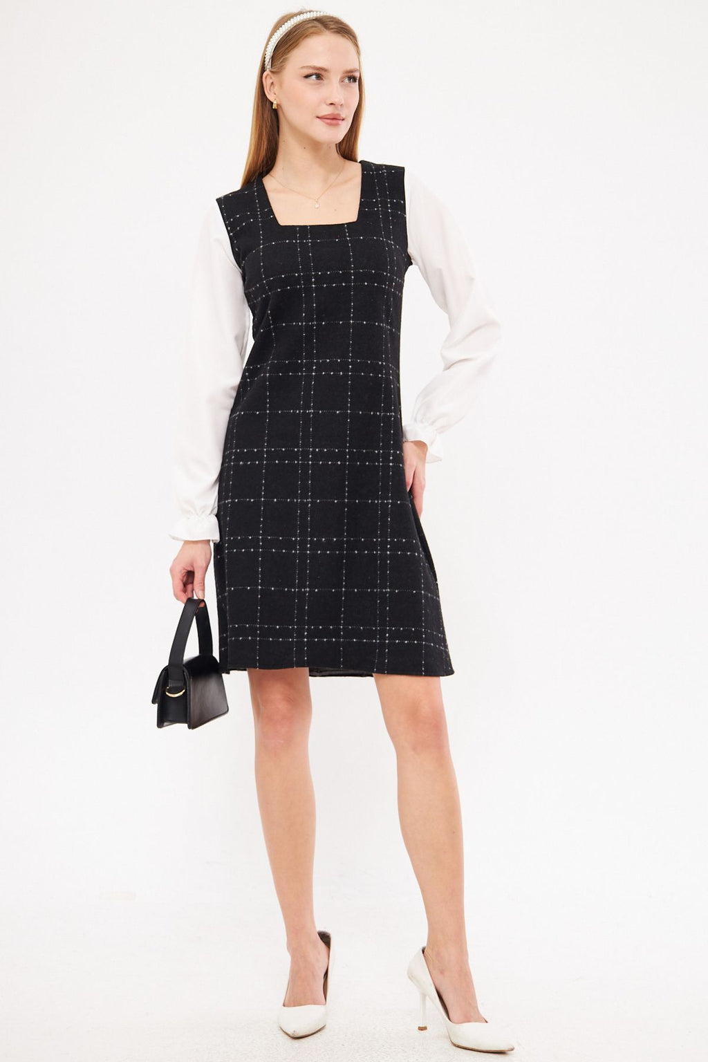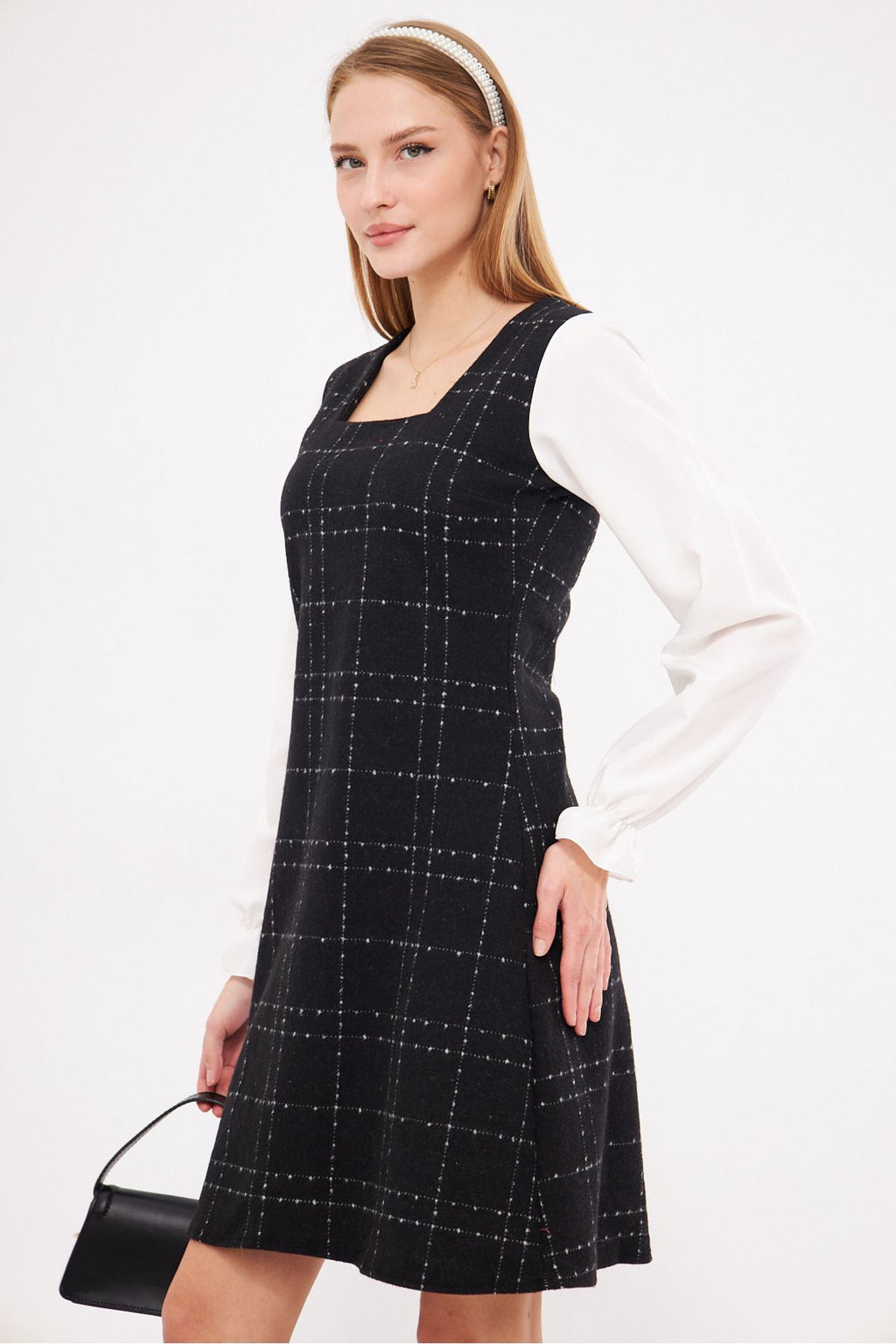 Kadın Siyah-Beyaz Ekoseli Kare Yaka Uzun Kol Elbise ARM-22Y001182