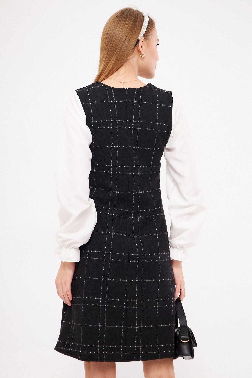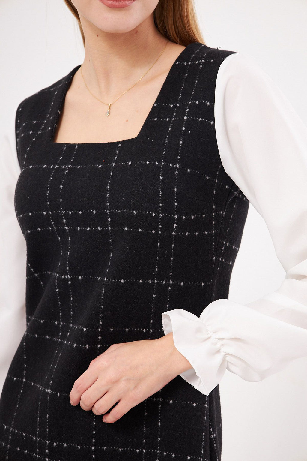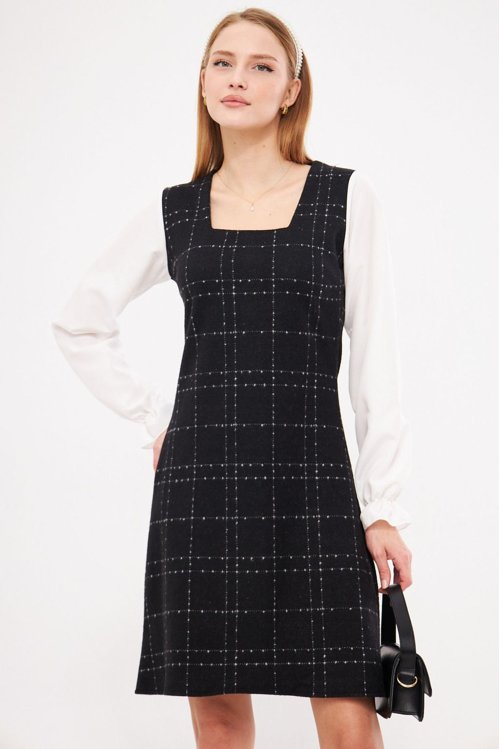 Kadın Siyah-Beyaz Ekoseli Kare Yaka Uzun Kol Elbise ARM-22Y001182