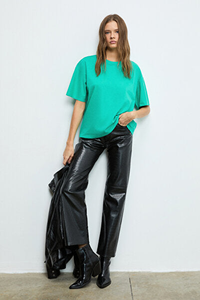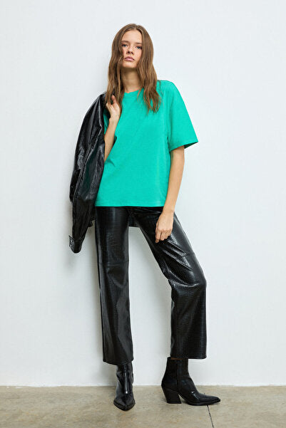 LAGERTHA Women's 100% Organic Cotton Thick Textured Oversize Fit Round Neck Green T-Shirt