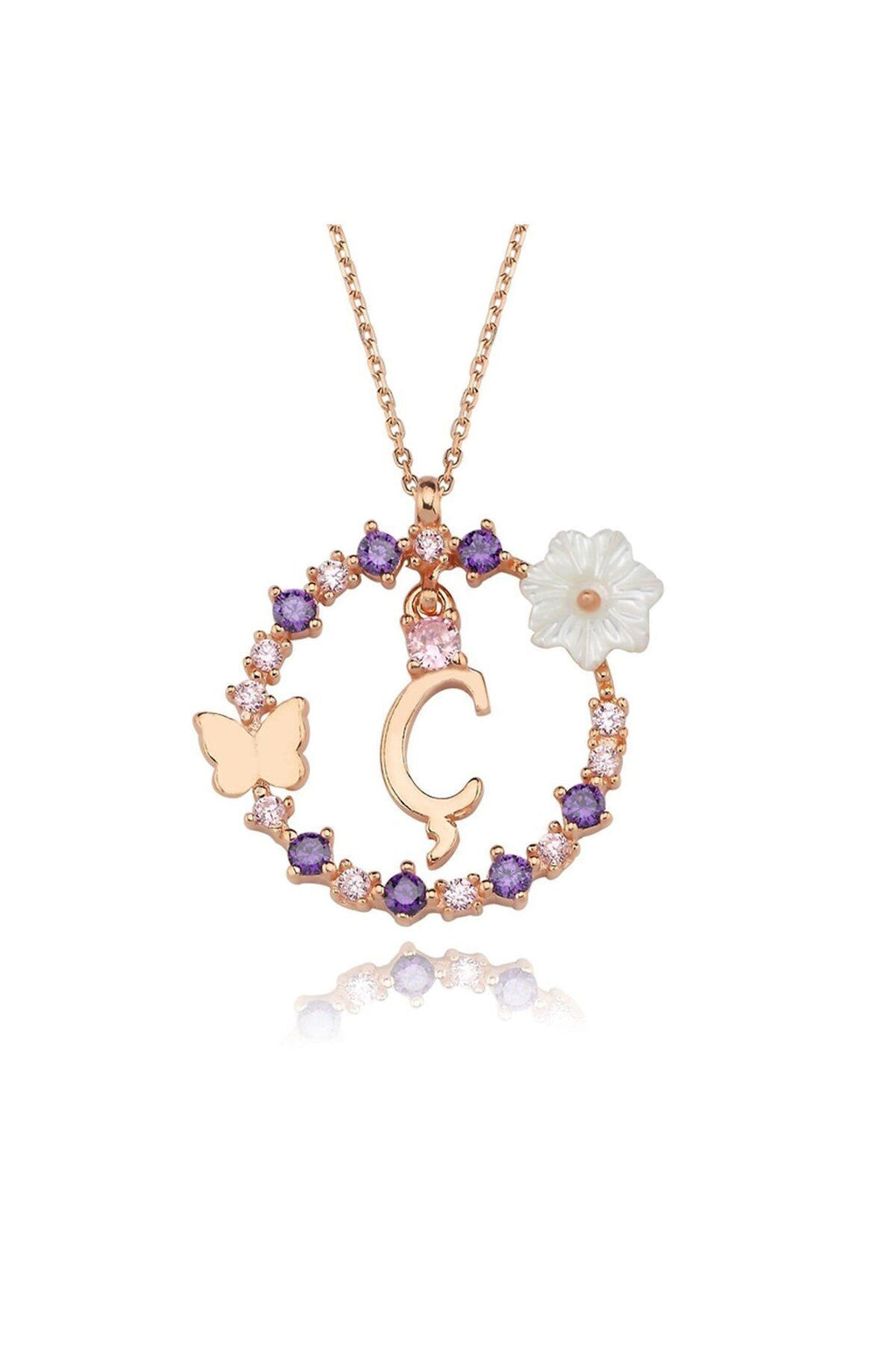 Magnolia Flower Dreams Glitter 14k Rose Gold Ç Letter Women Necklace