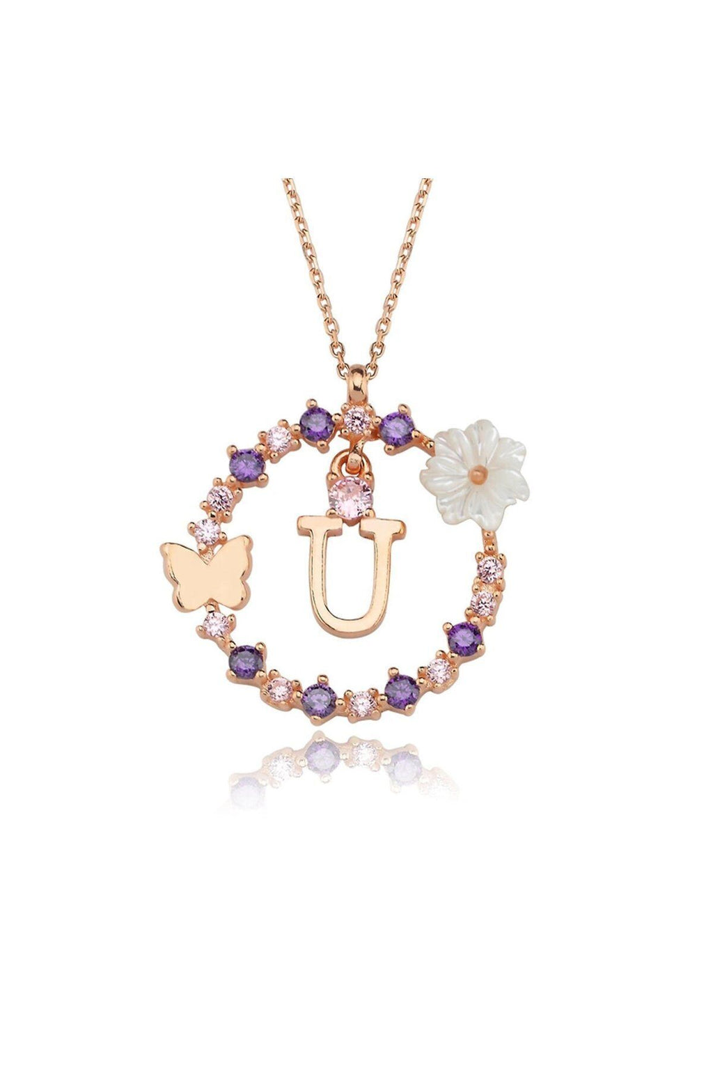Magnolia Flower Dreams Glitter 14k Rose Gold U Letter Women Necklace