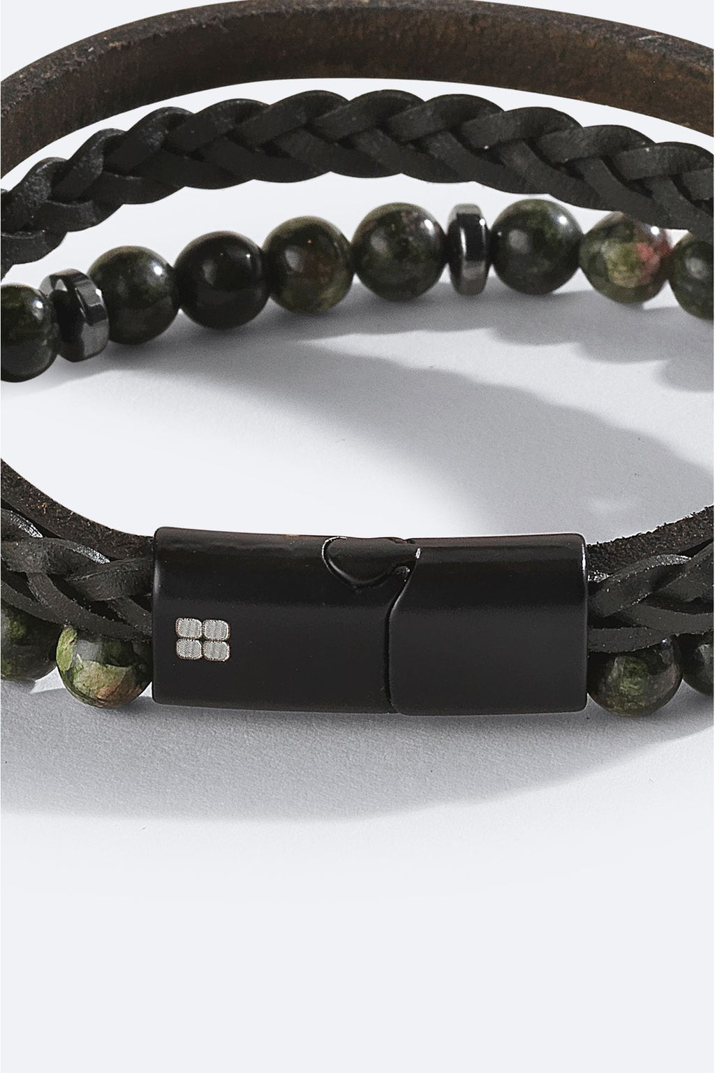 Male Khaki Leather Ceyt and Hematitis Stone Bracelet A42y9614