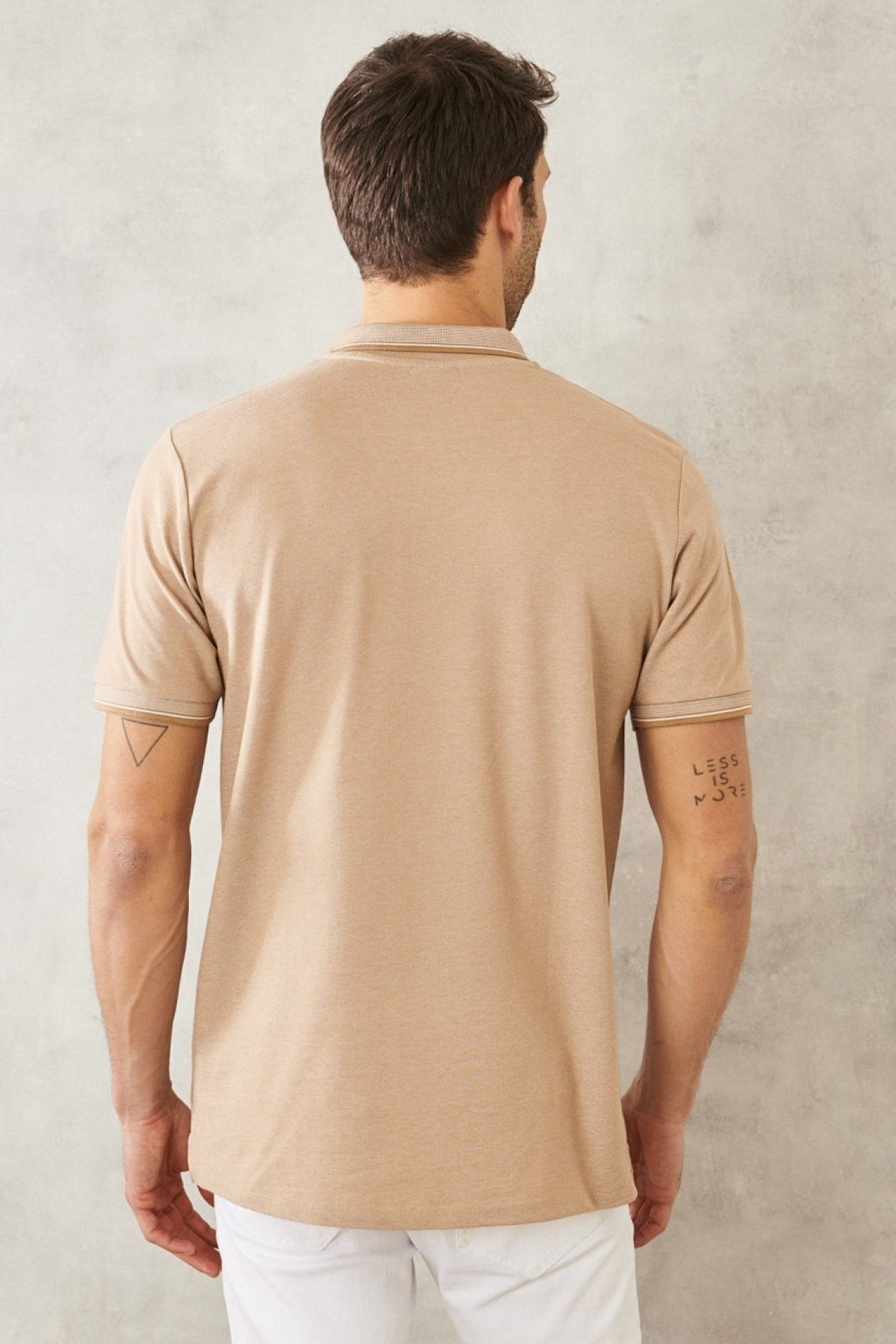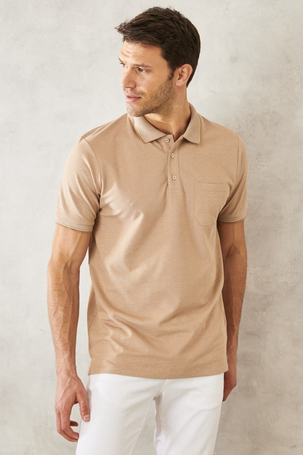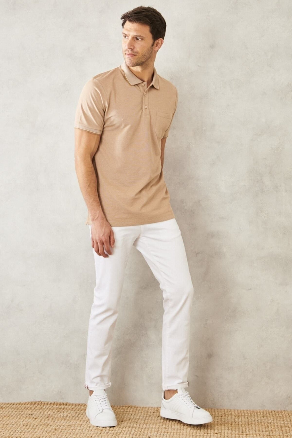 Men-Plugging Cotton Fabric Comfort Fit Casual Cutting Beige-White Curlled Polo Yaka Pocket T-shirt