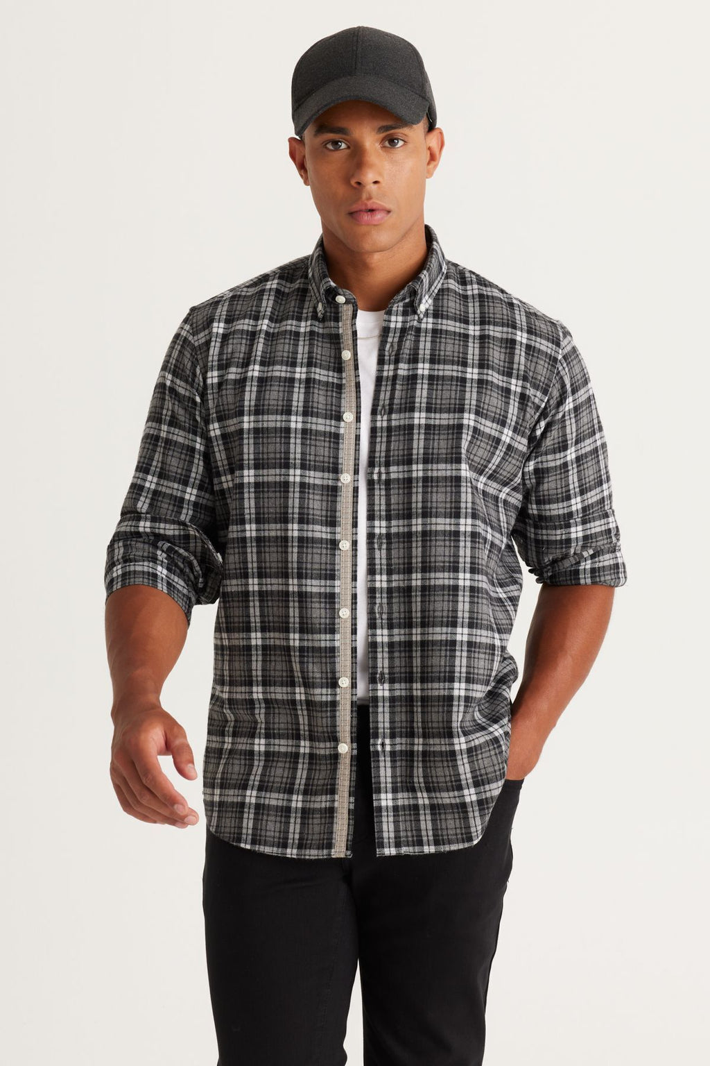 Men's anthracit-gray comfort fit comfortable cut buttoned collar cotton checkered shirt