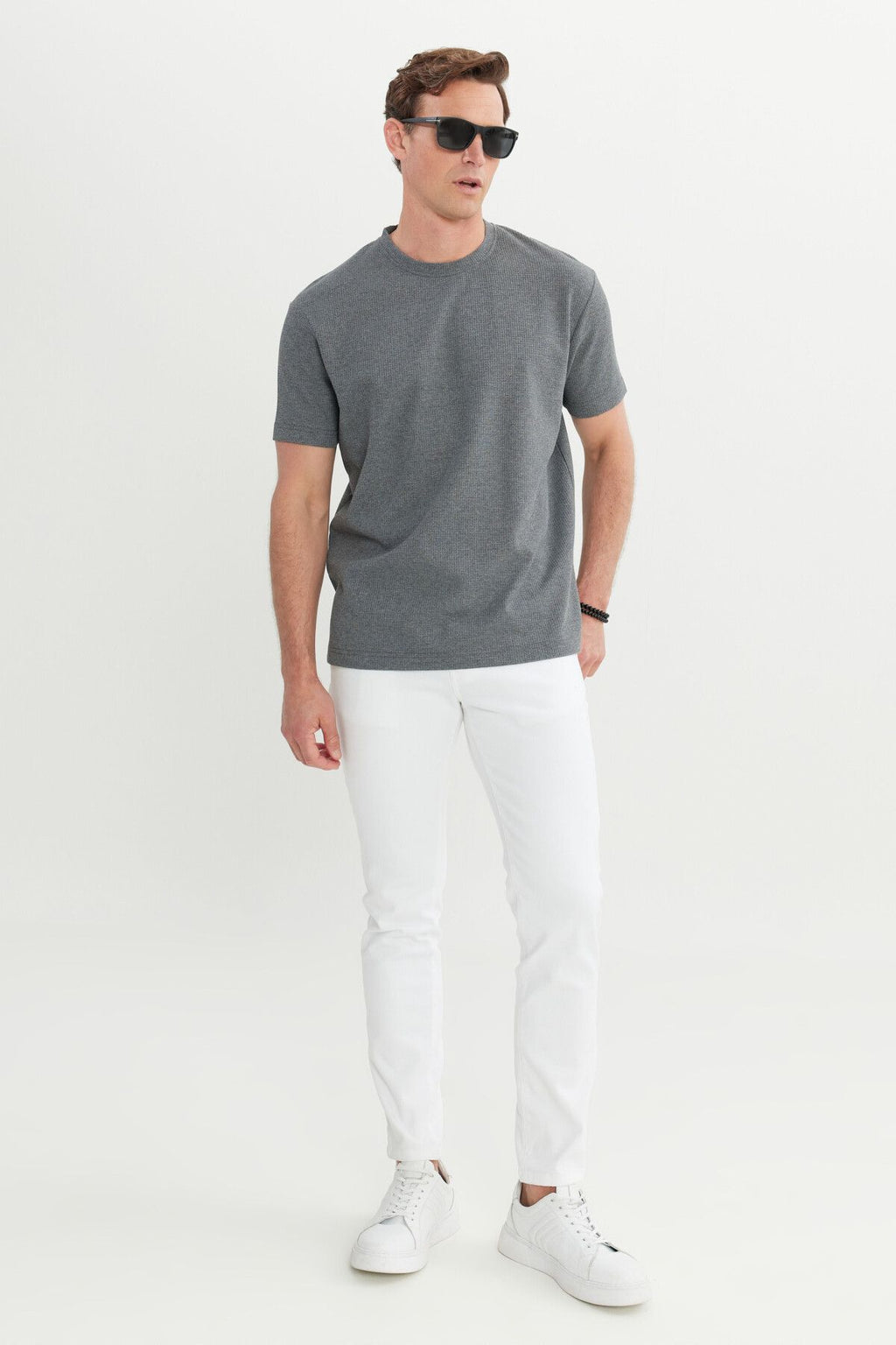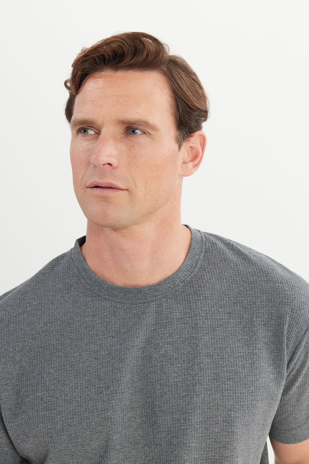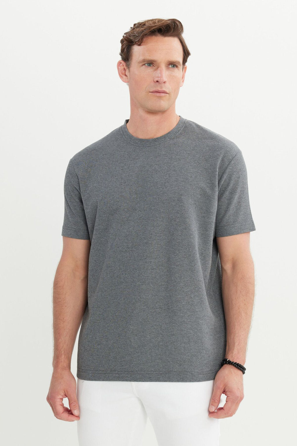 Men's anthracite-melanj cotton modern fit comfortable cut bike collar wafer patterned T-shirt