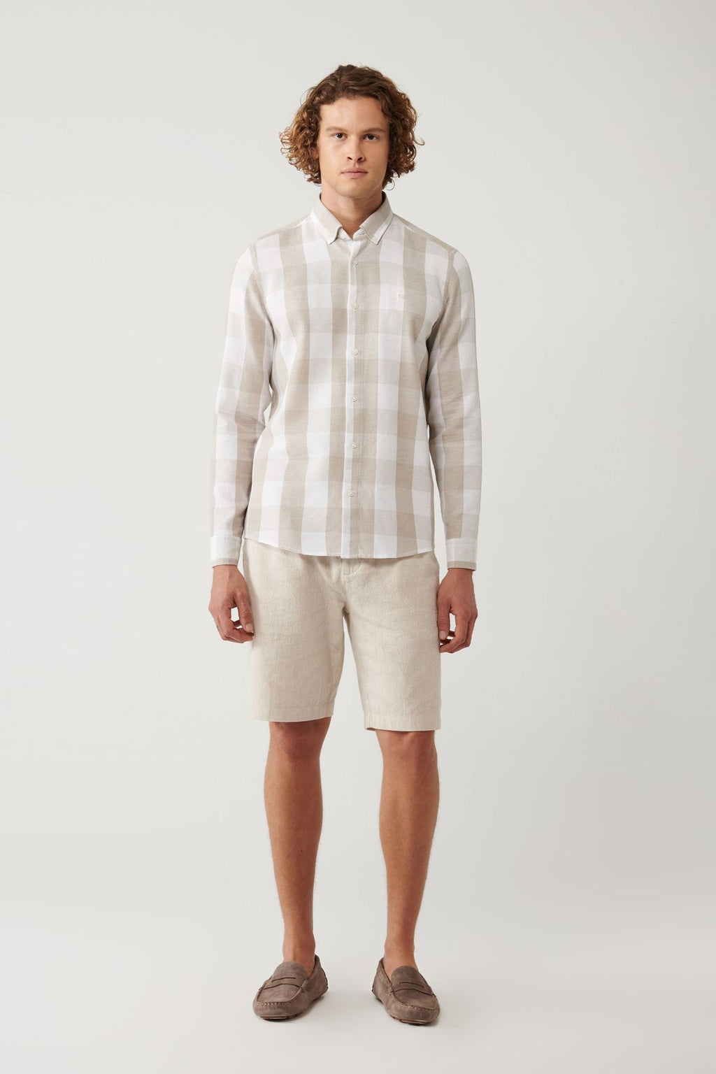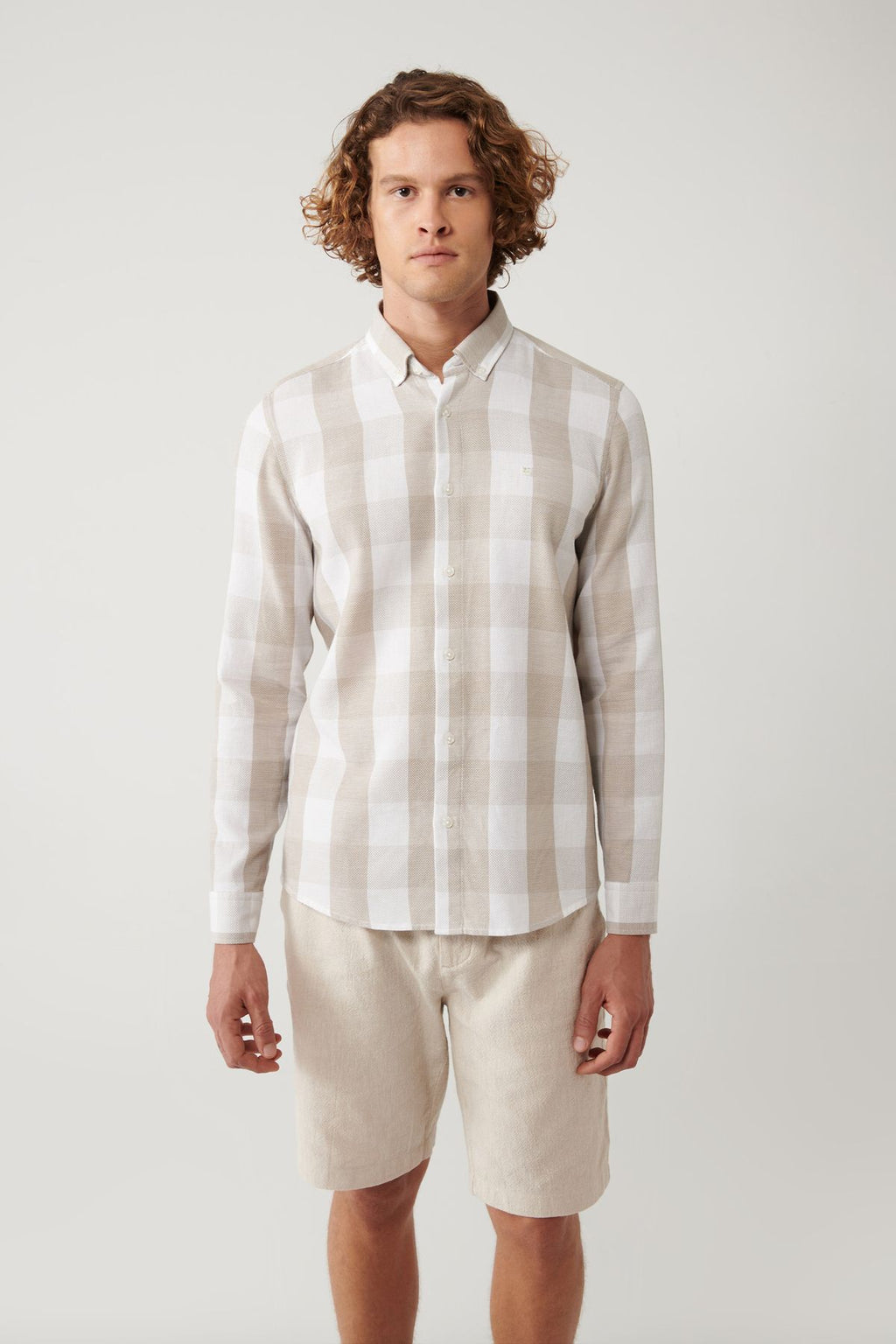 Men's beige 100 %cotton button collar cotton plaid textured shirt A41y2044