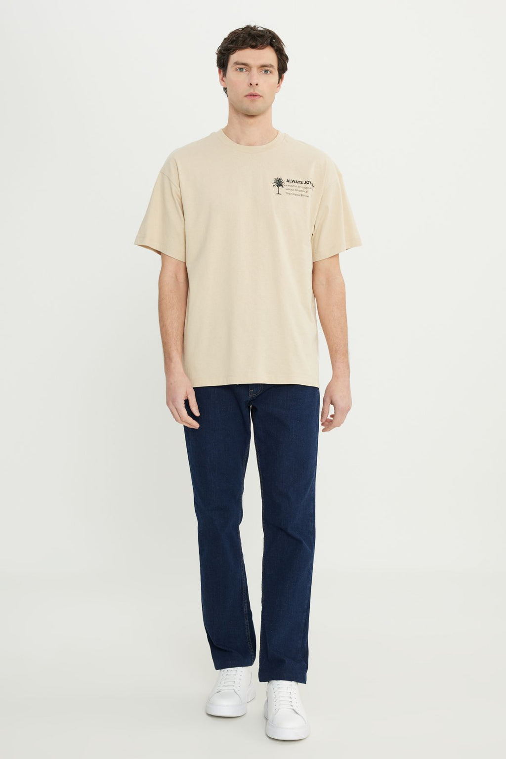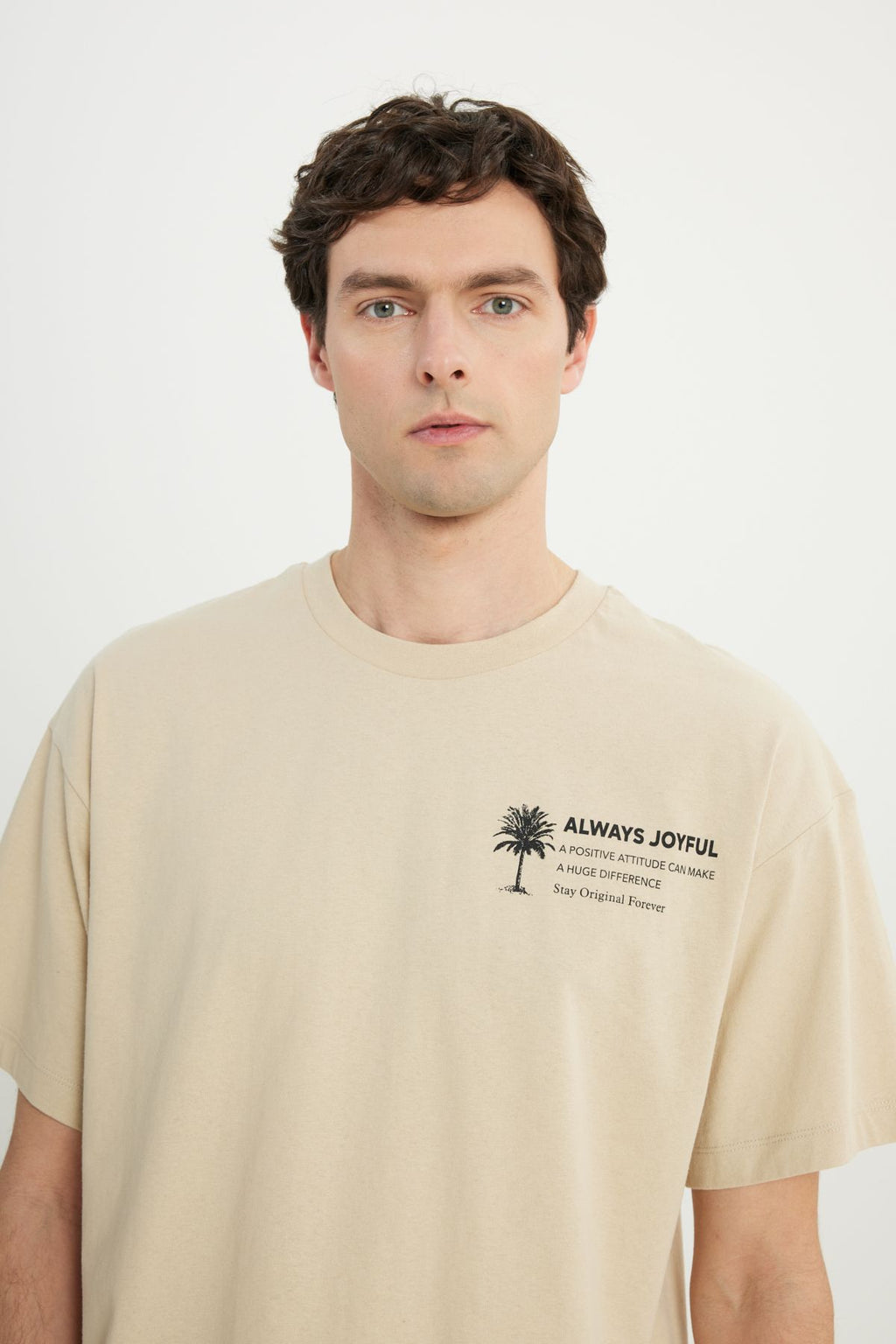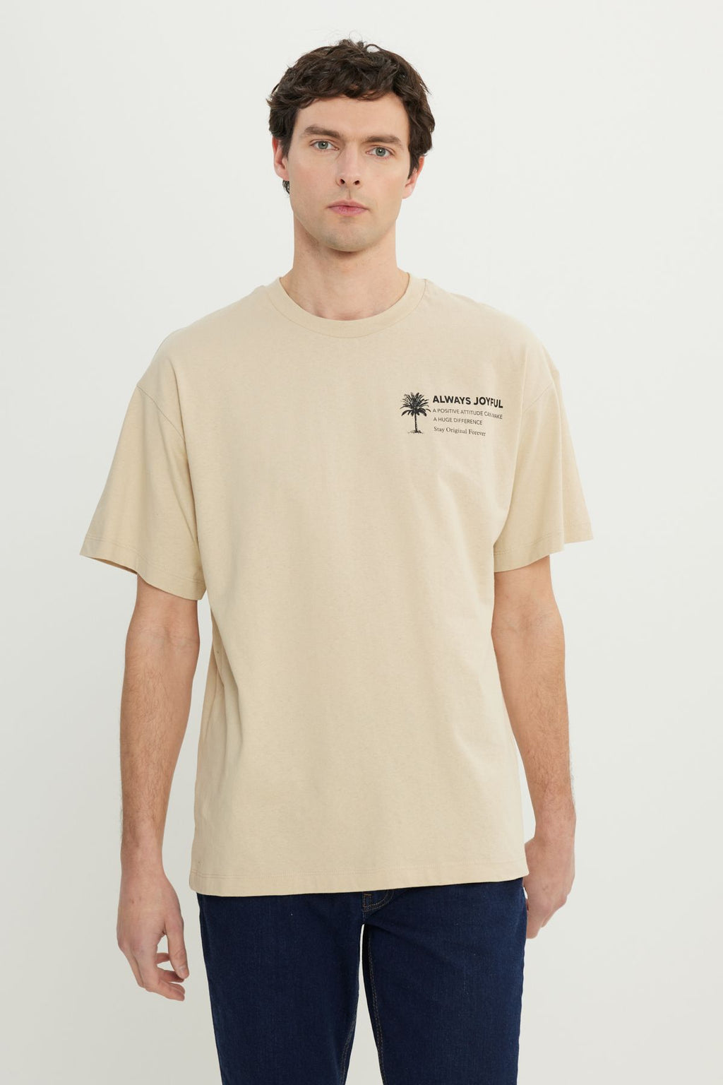 Men's Beige 100 %Cotton Oversizle Fit Casual Cut Bicycle Collar Printed T -shirt