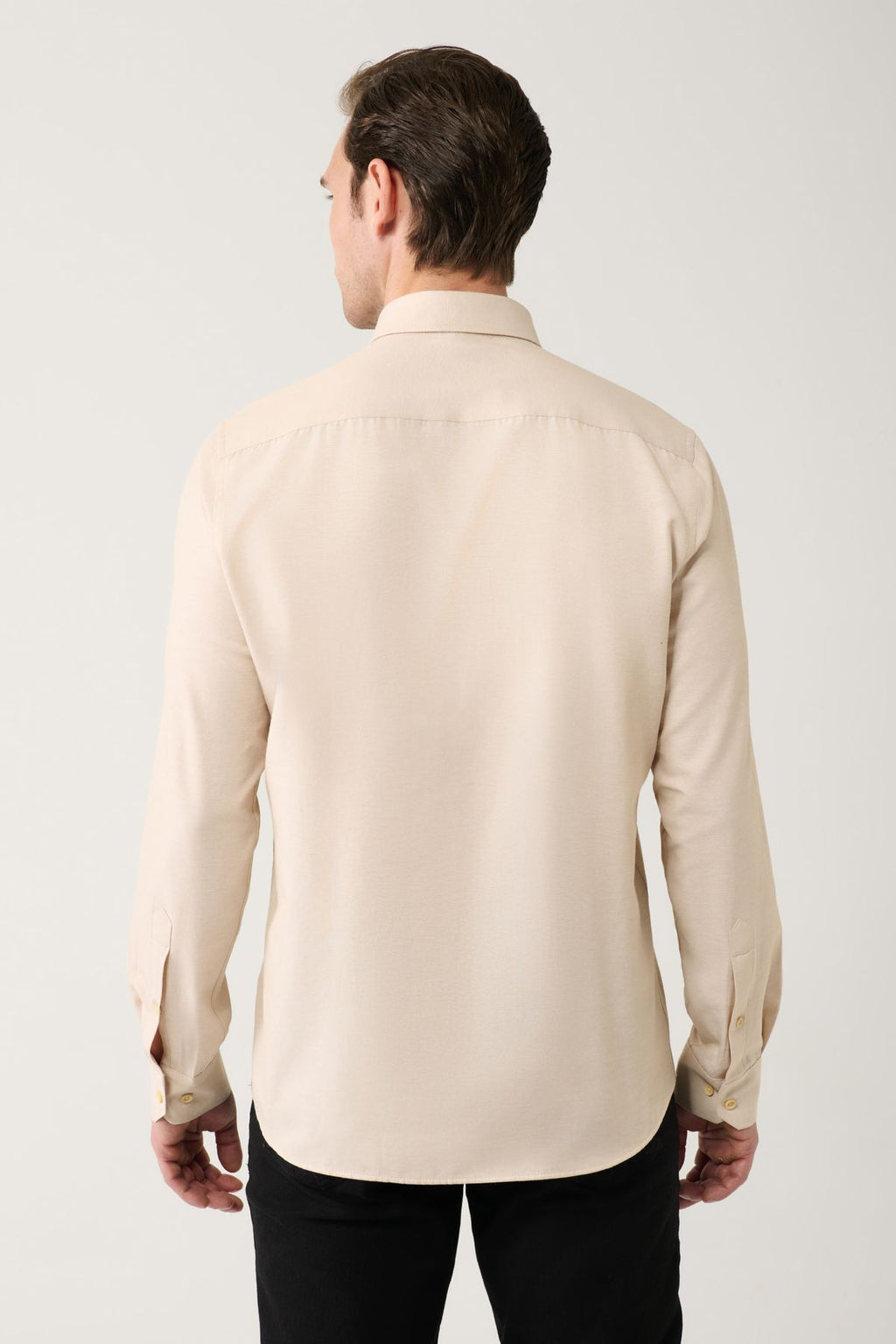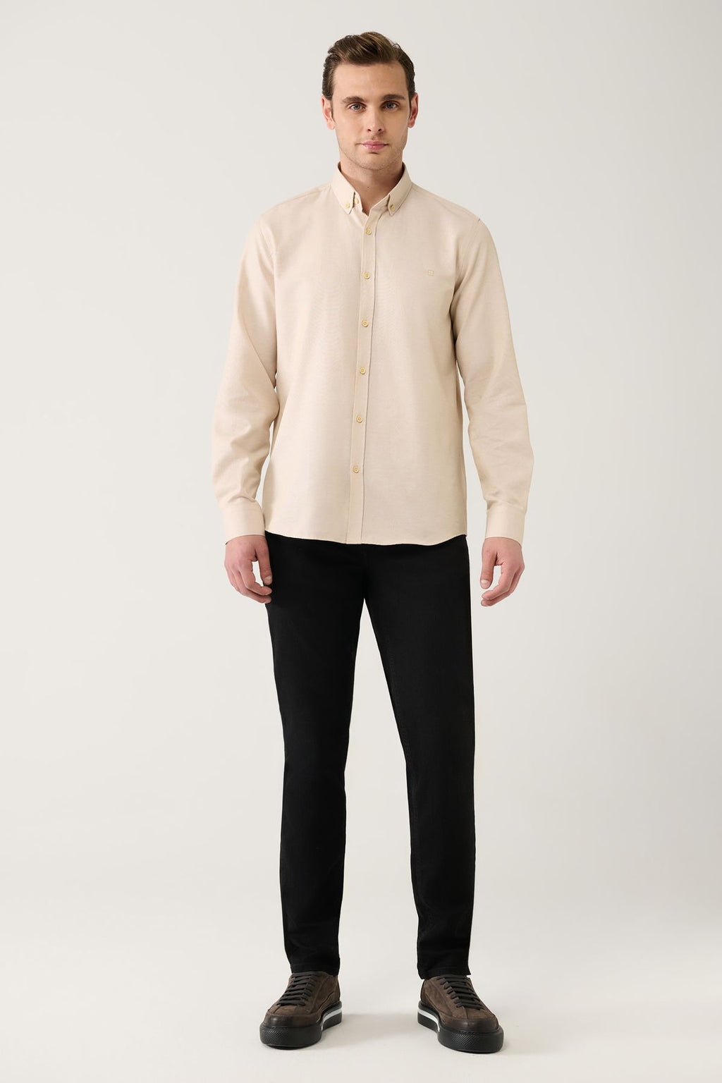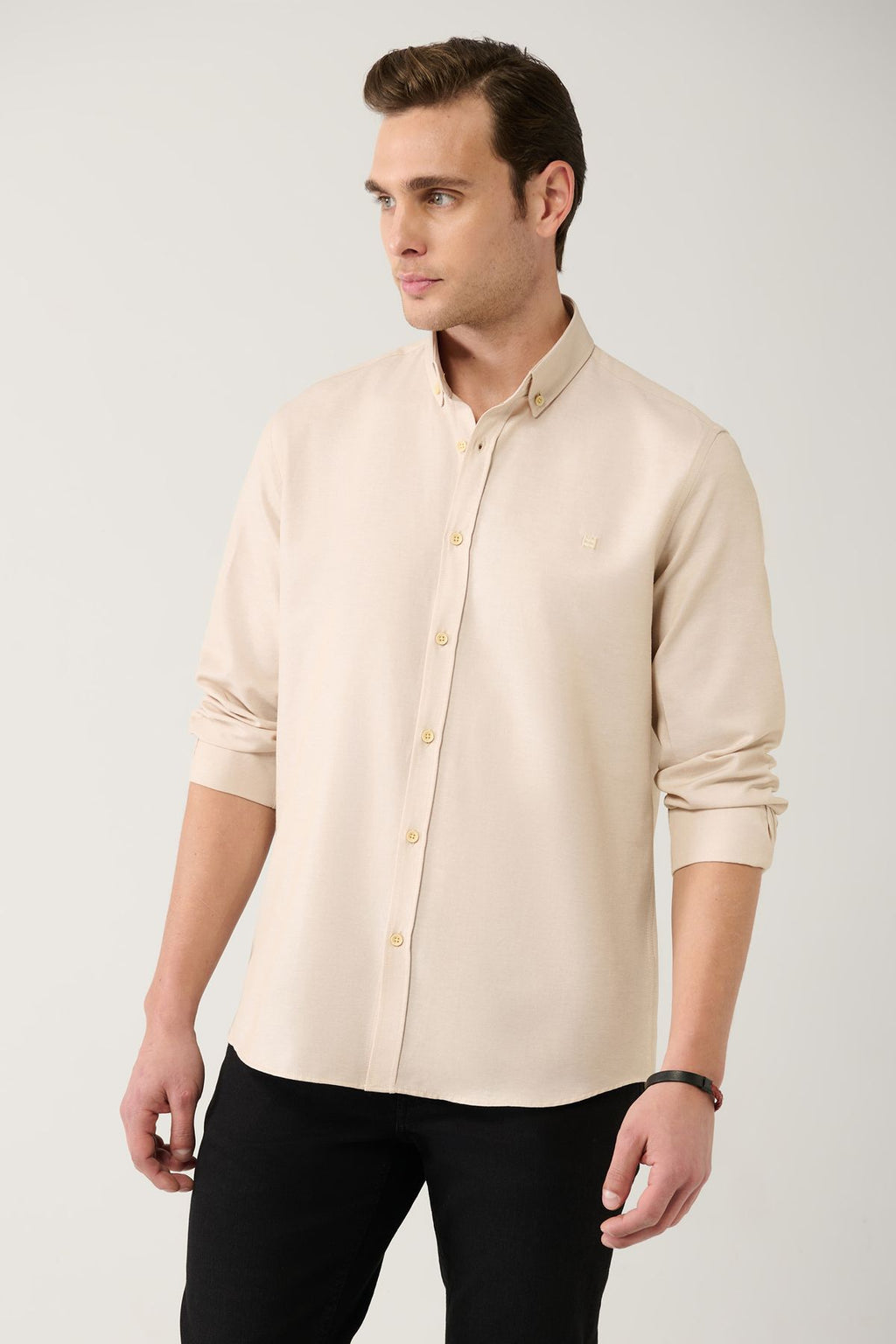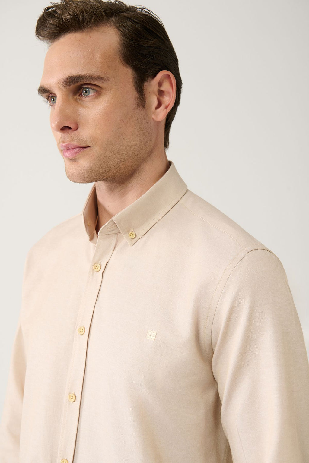 Men's beige button collar easily ironed cotton Oxford Shirt E002000