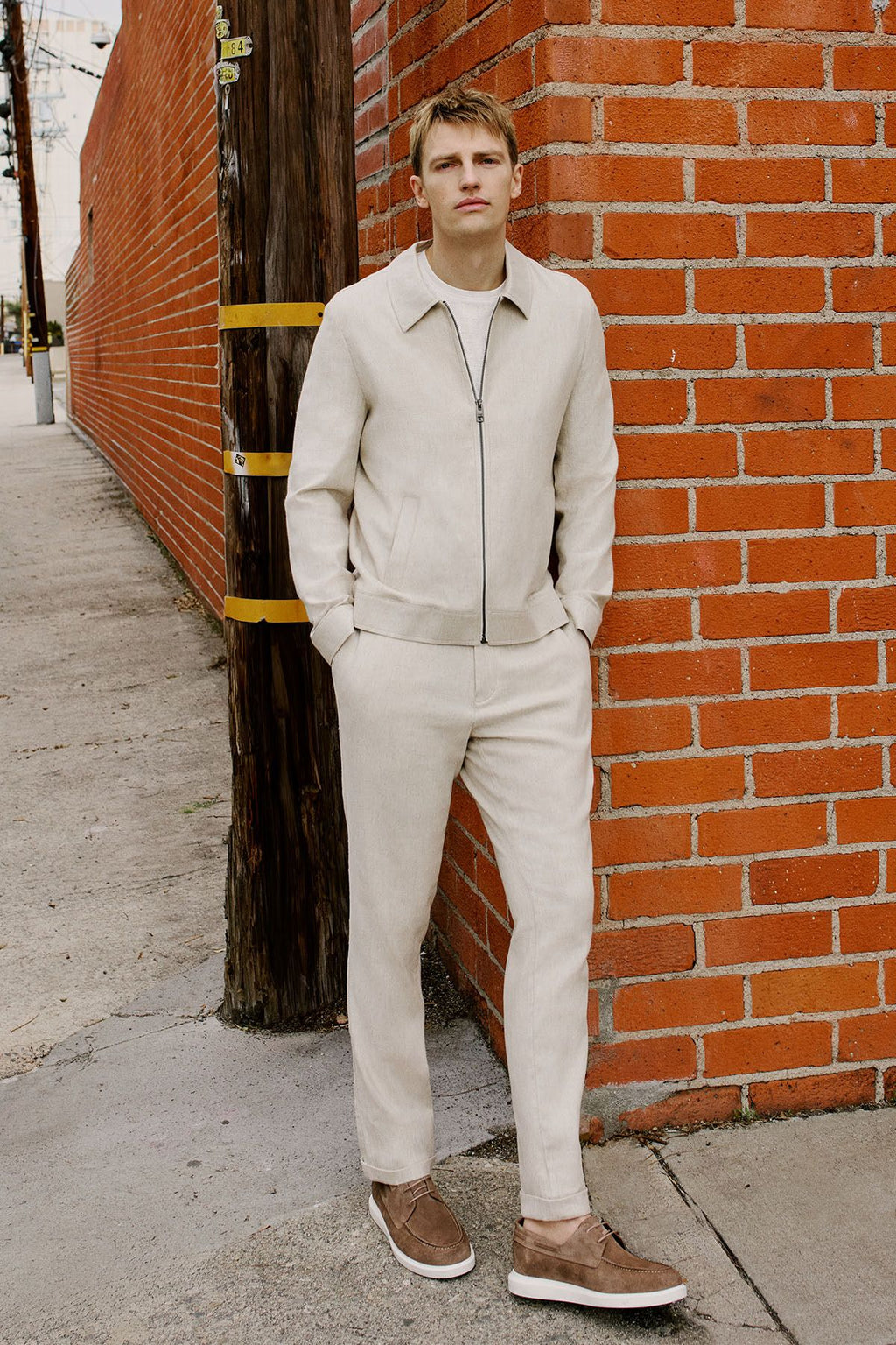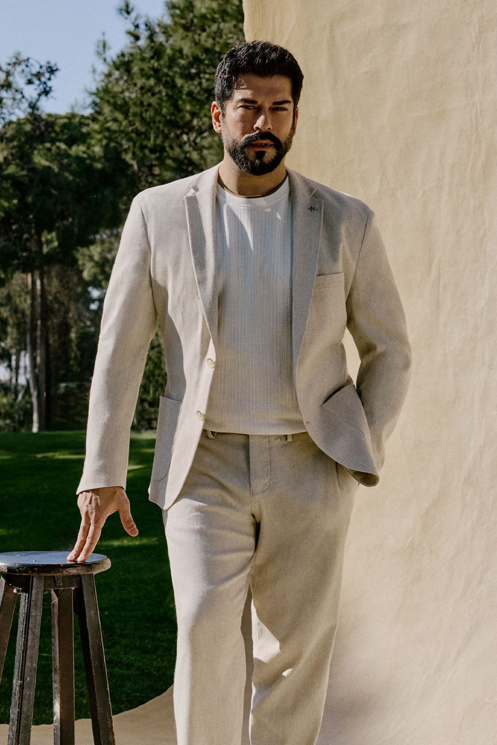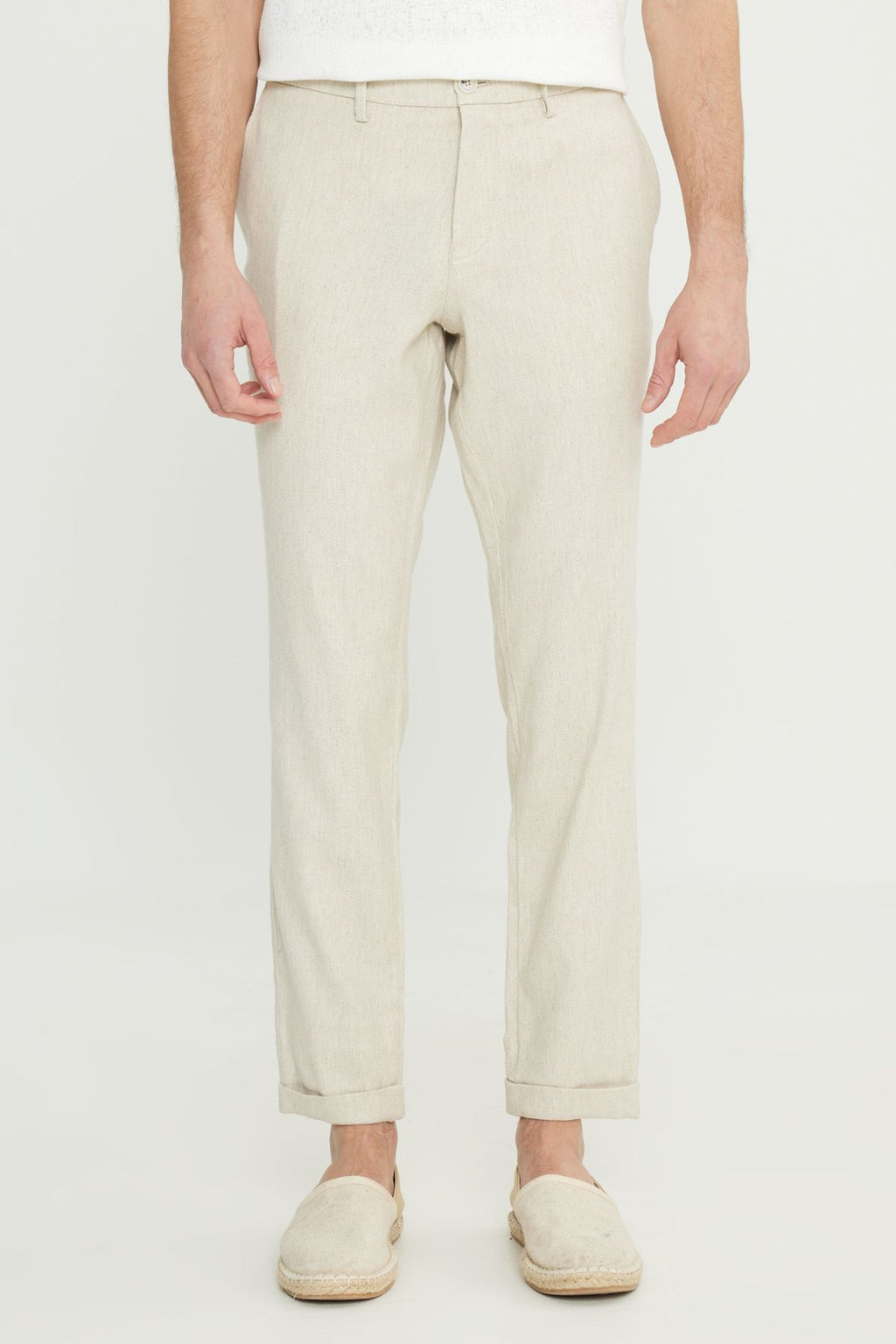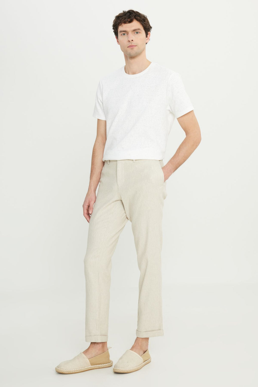 Men's Beige Slim Fit Narrow Cut Diagonal Patterned Casual Pants with Side Pockets