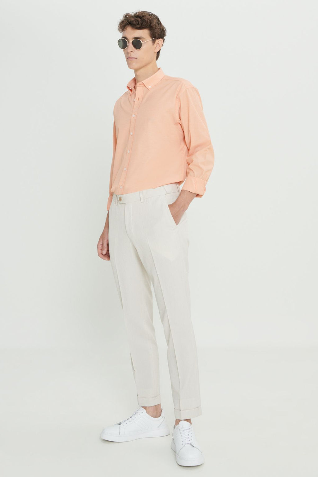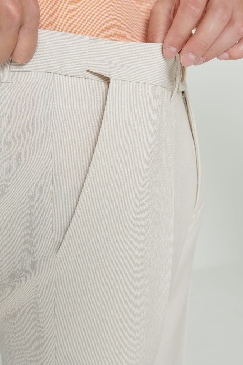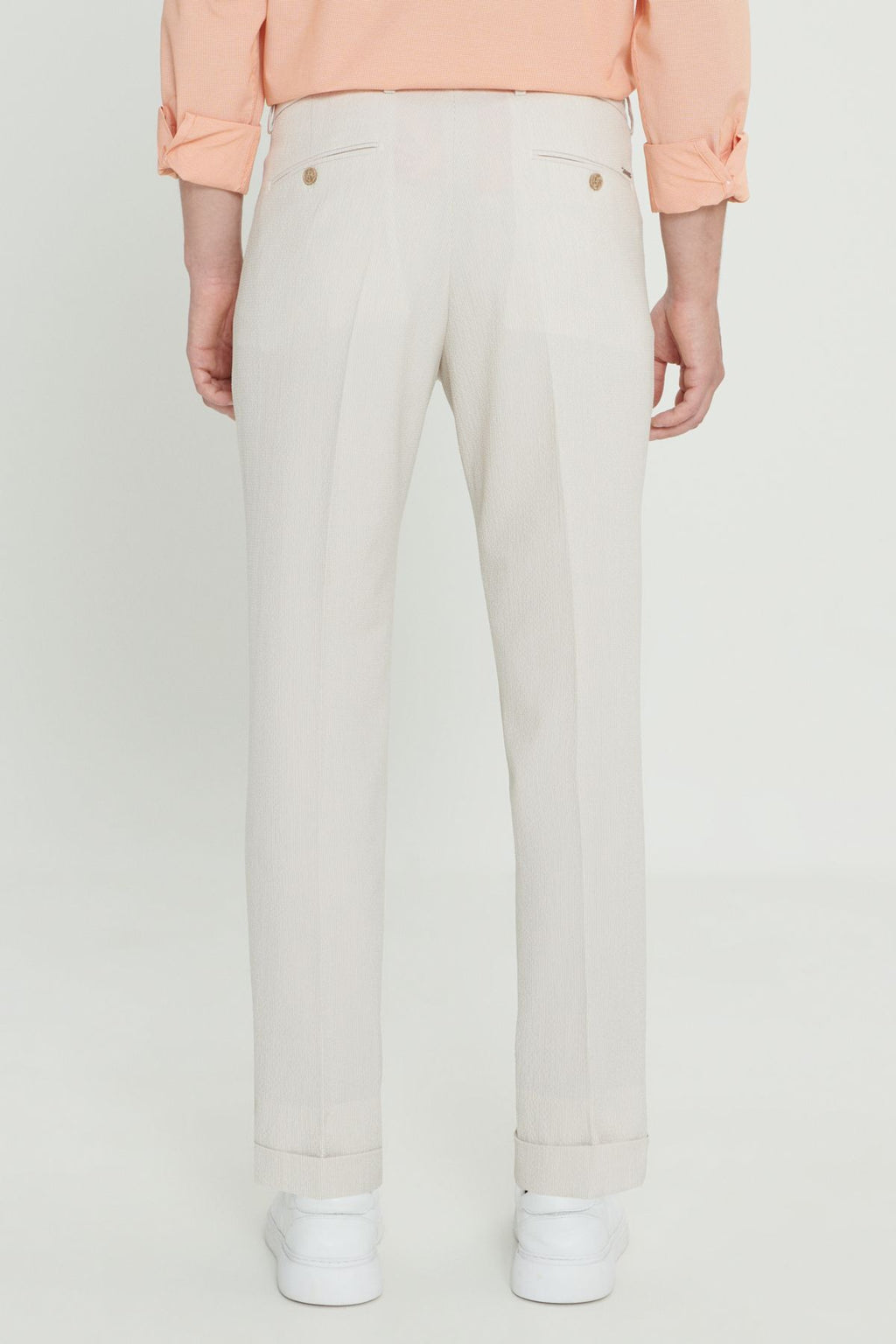 Men's Beige Slim Fit Narrow Cutter Wrinkling Fabric Waophre Patterned Waist Waist Pants