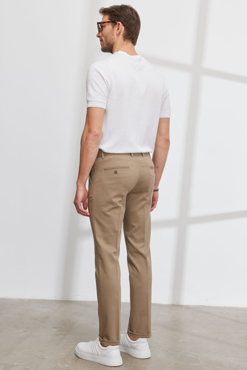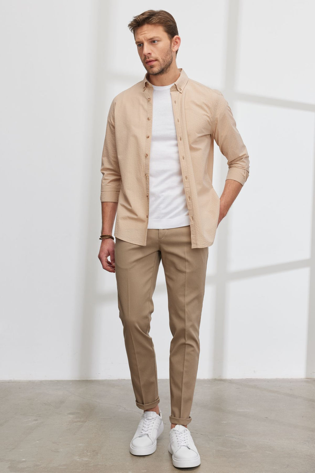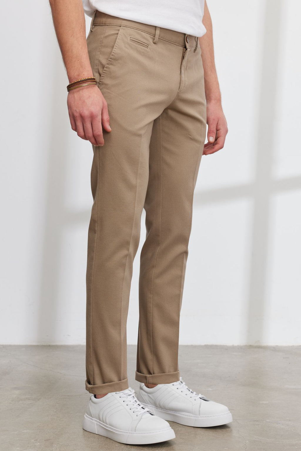 Men's Beige Slim Fit Narrow Cutting Side Pocket Cotton Flexible Amelor Pants
