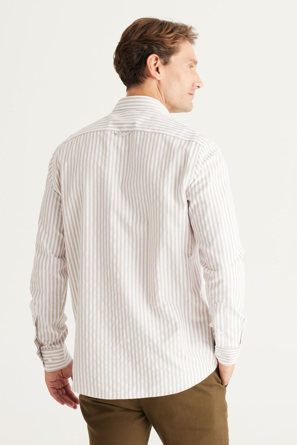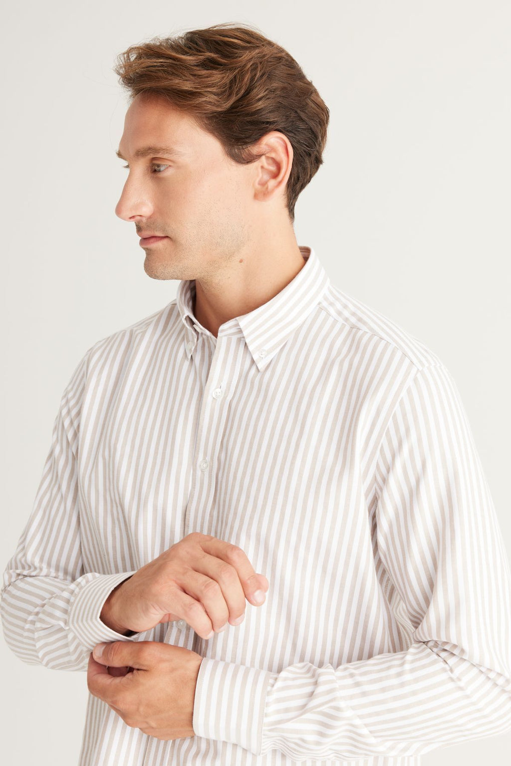 Men's beige-white slim fit narrow cut buttoned collar cotton striped shirt