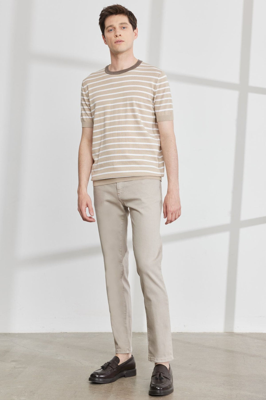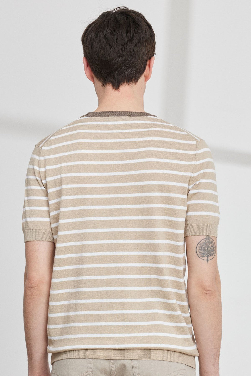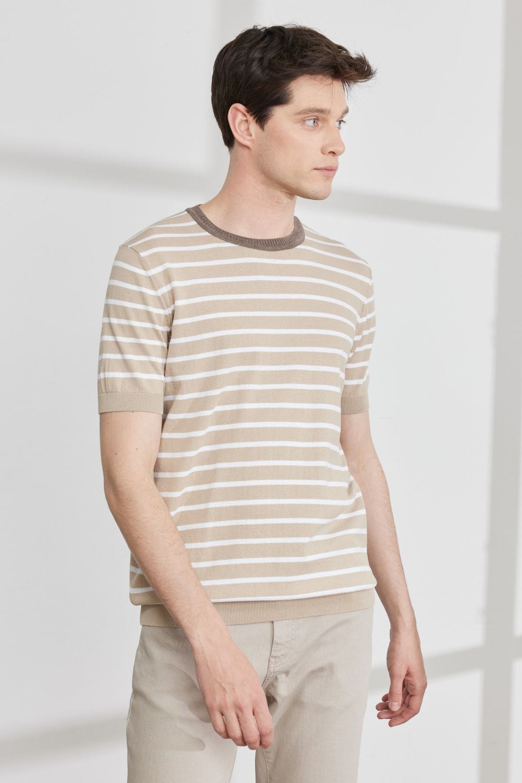 Men's Beige-White standard Fit Normal Normal Cut Bicycle Yaka 100 %Cotton Striped Triko T-shirt