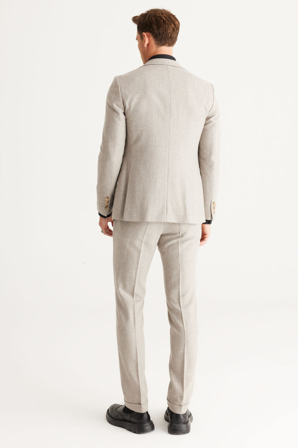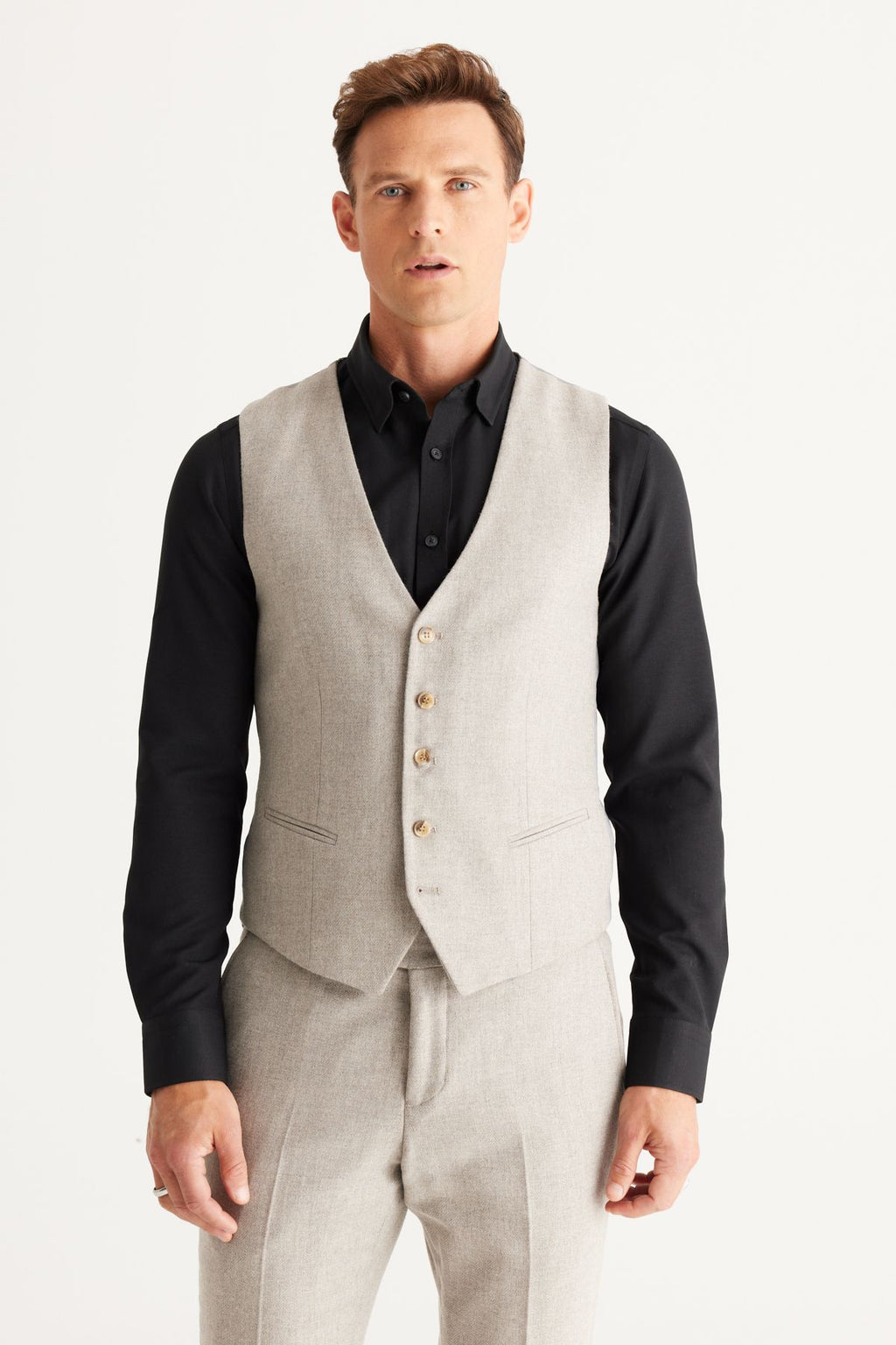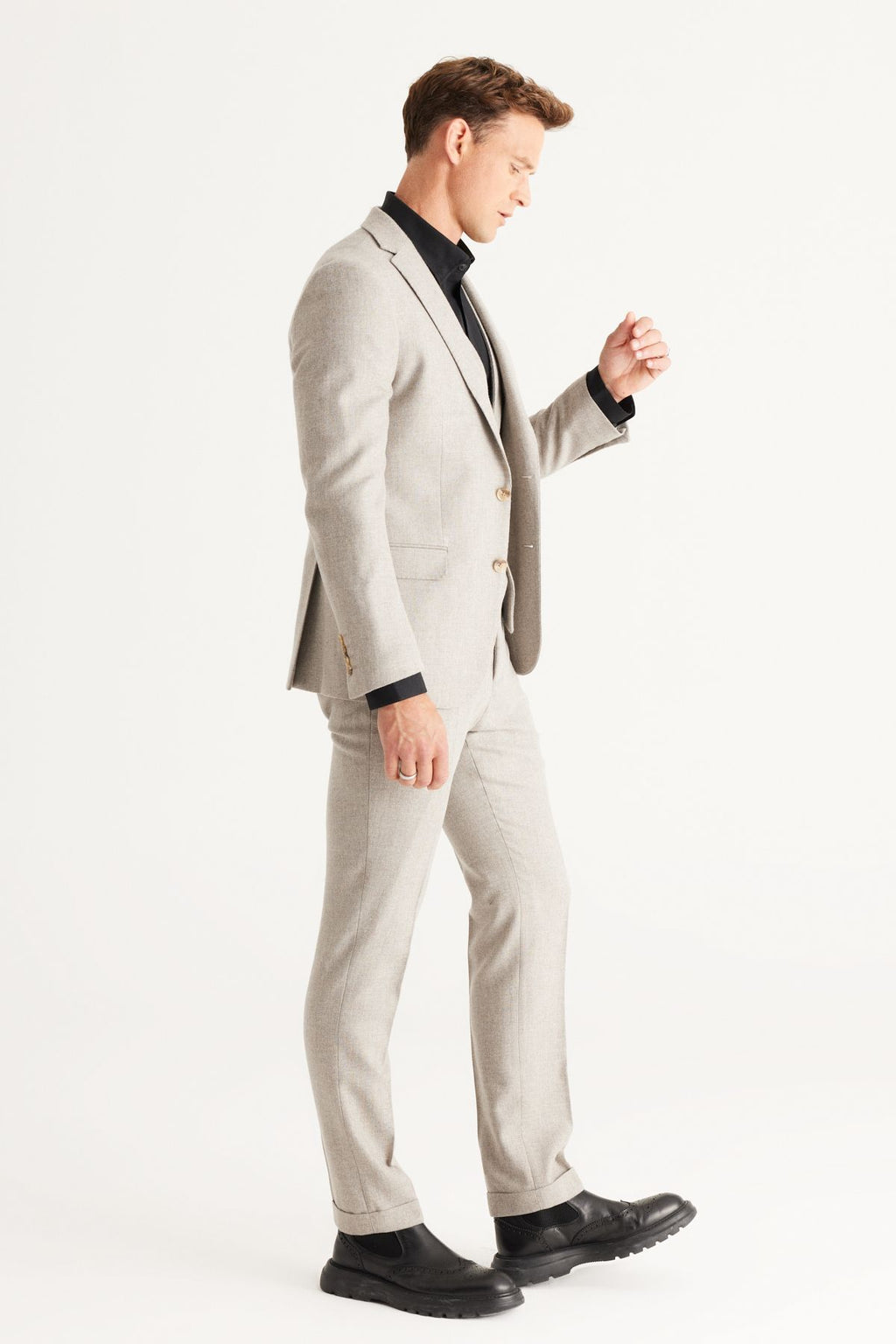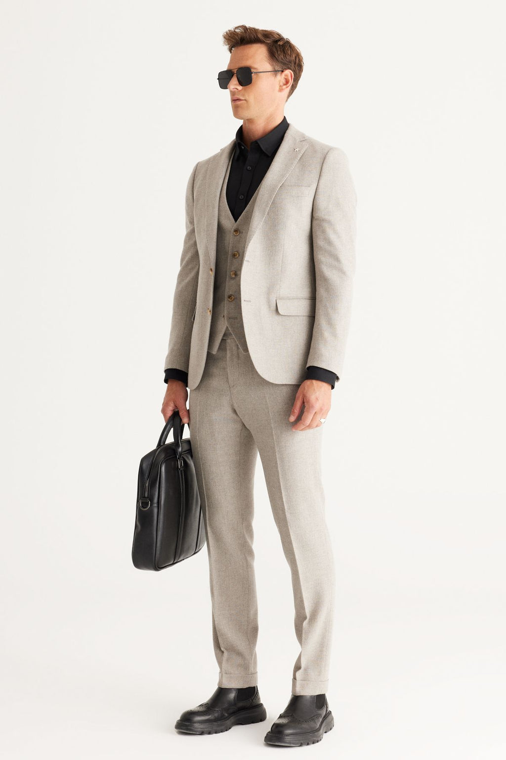 Men's beige woolen slim fit narrow cutting mono collar patterned vest suit suits