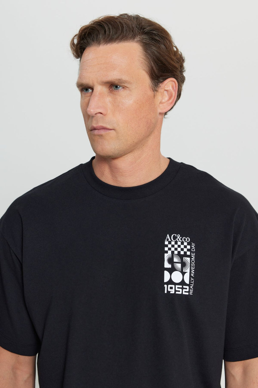 Men's black 100 %cotton oversizle fit abundant cut bicycle collar printed T -shirt