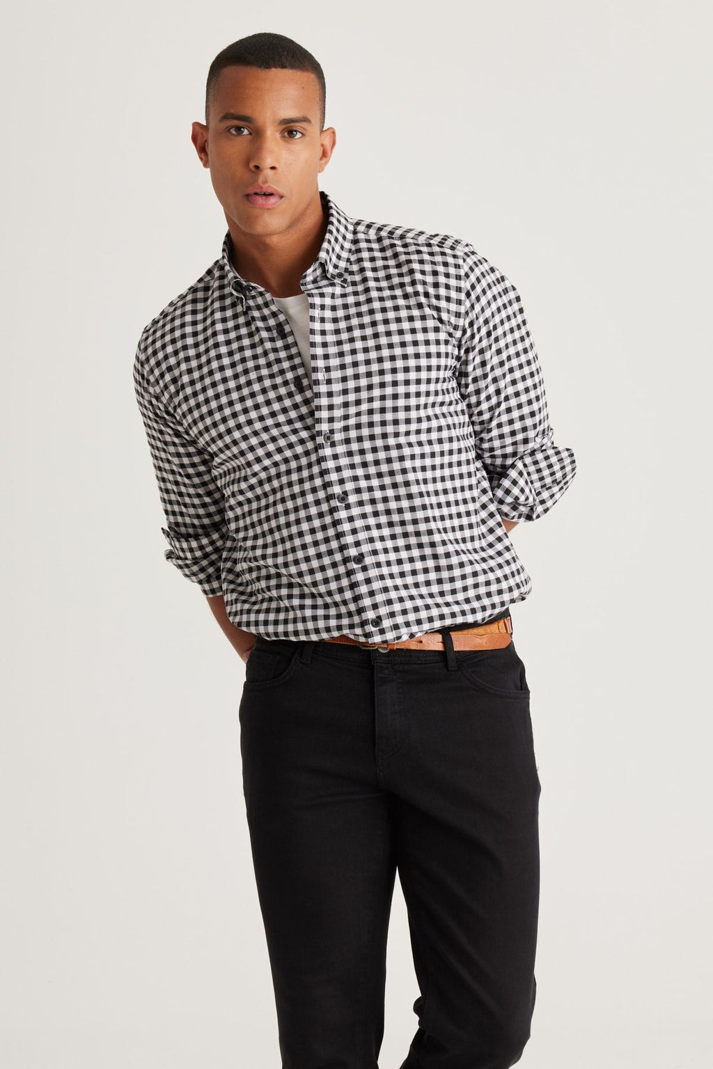 Men's black-and-white slim fit narrow cut buttoned collar cotton checkered shirt