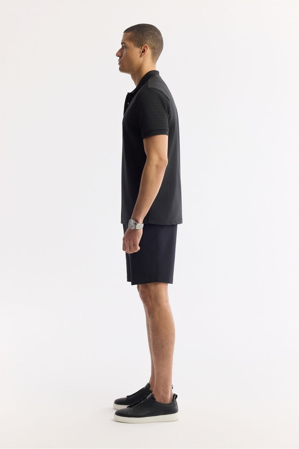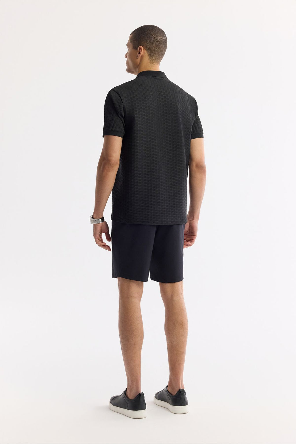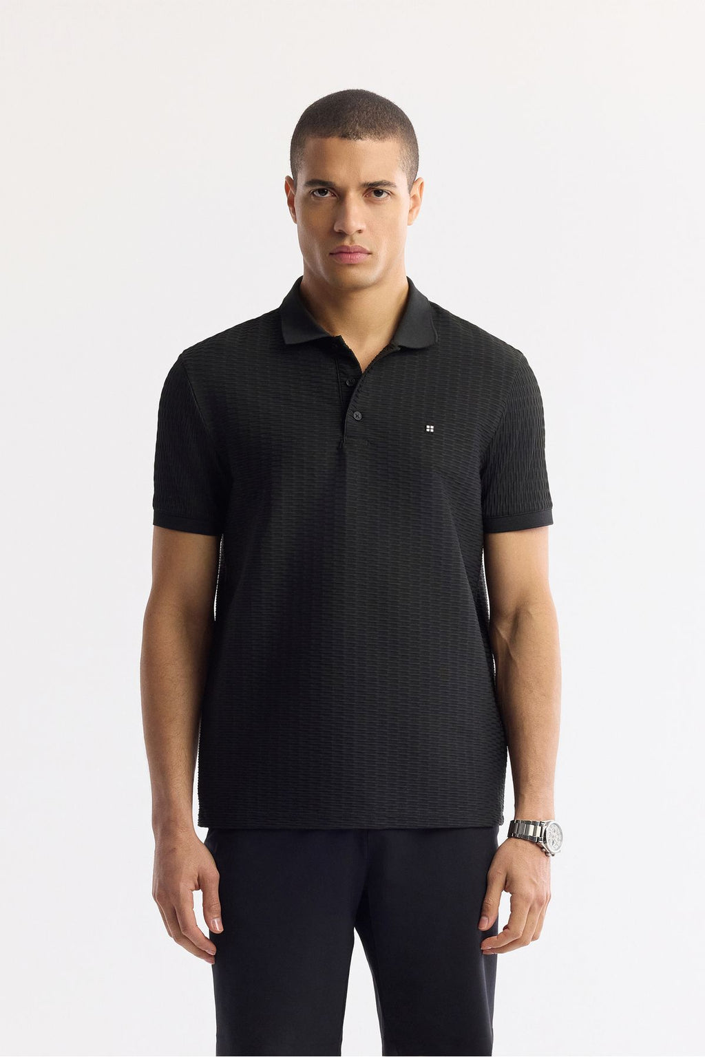Men's black button polo collar textured jacquard t-shirt A51y1121
